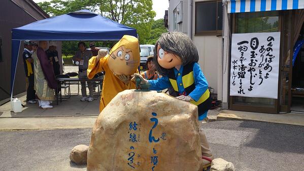 目玉おやじブロンズ像除幕式@一畑薬師。一畑薬師は、島根県松江にある目のお薬師さんで、のんのんばあが深く信仰していました。のんのんばあは、少年時代の水木しげるに妖怪話をしてくれたおばあさんです。敬意を表して控え目にポーズ。 pic.twitter.com/2q0imgEIv1