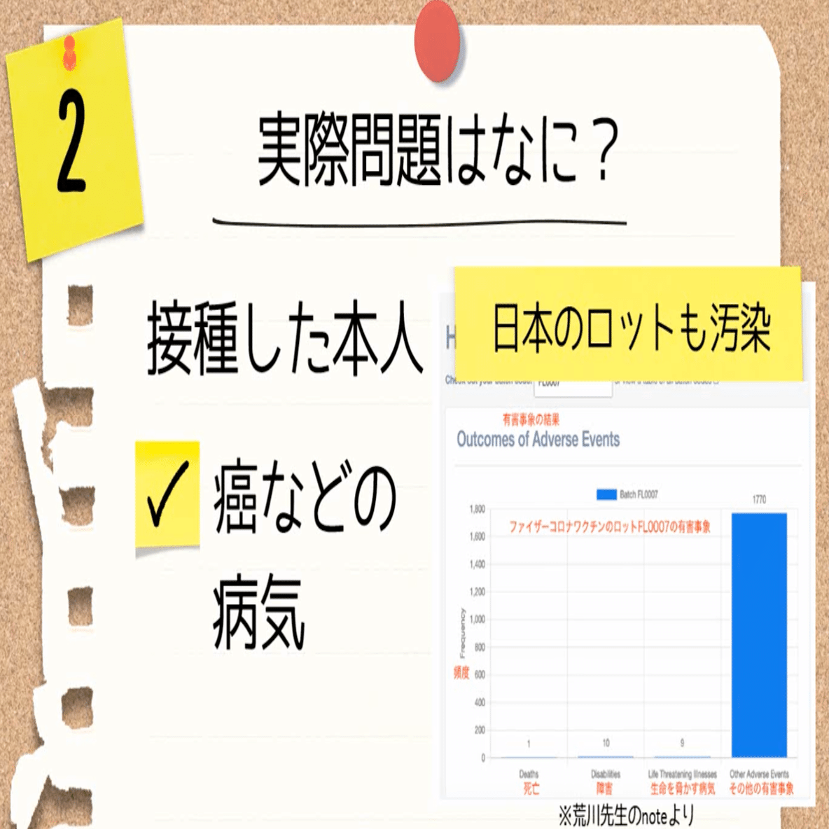 日本のロットも実は汚染されていた、ということが分かりまして、こちら(スライド右下)は荒川先生のnote(※)から拝借した図なんですけども、有害事象がたくさん出ているロットで、やはりDNAの汚染が確認されたという事実もあります。