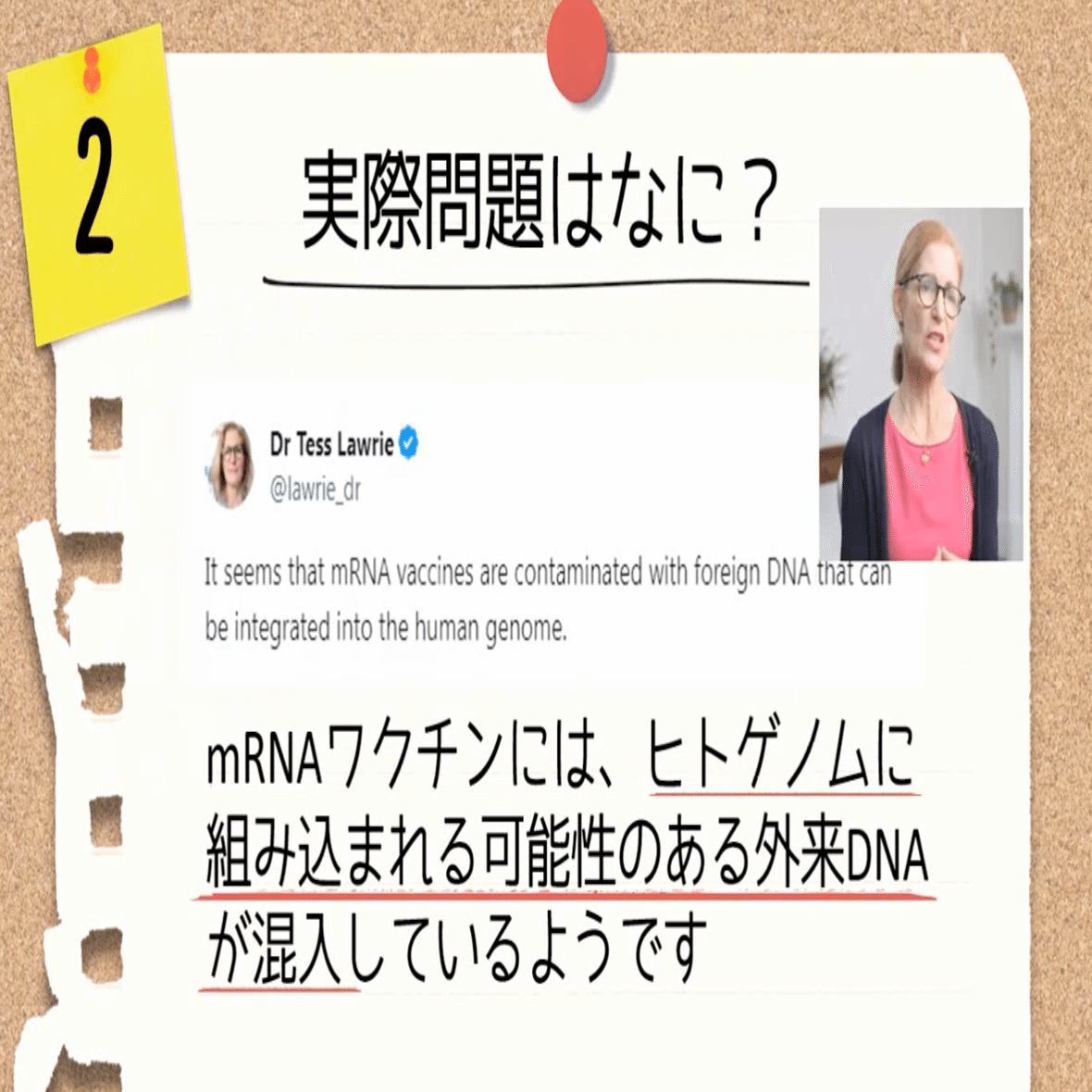 また、WCHを創設したテス・ローリー博士は、「mRNA㋻㋗㋠㋞には、ヒトゲノムに組み込まれる可能性のある外来DNAが混入しているようです」とツイートしています。