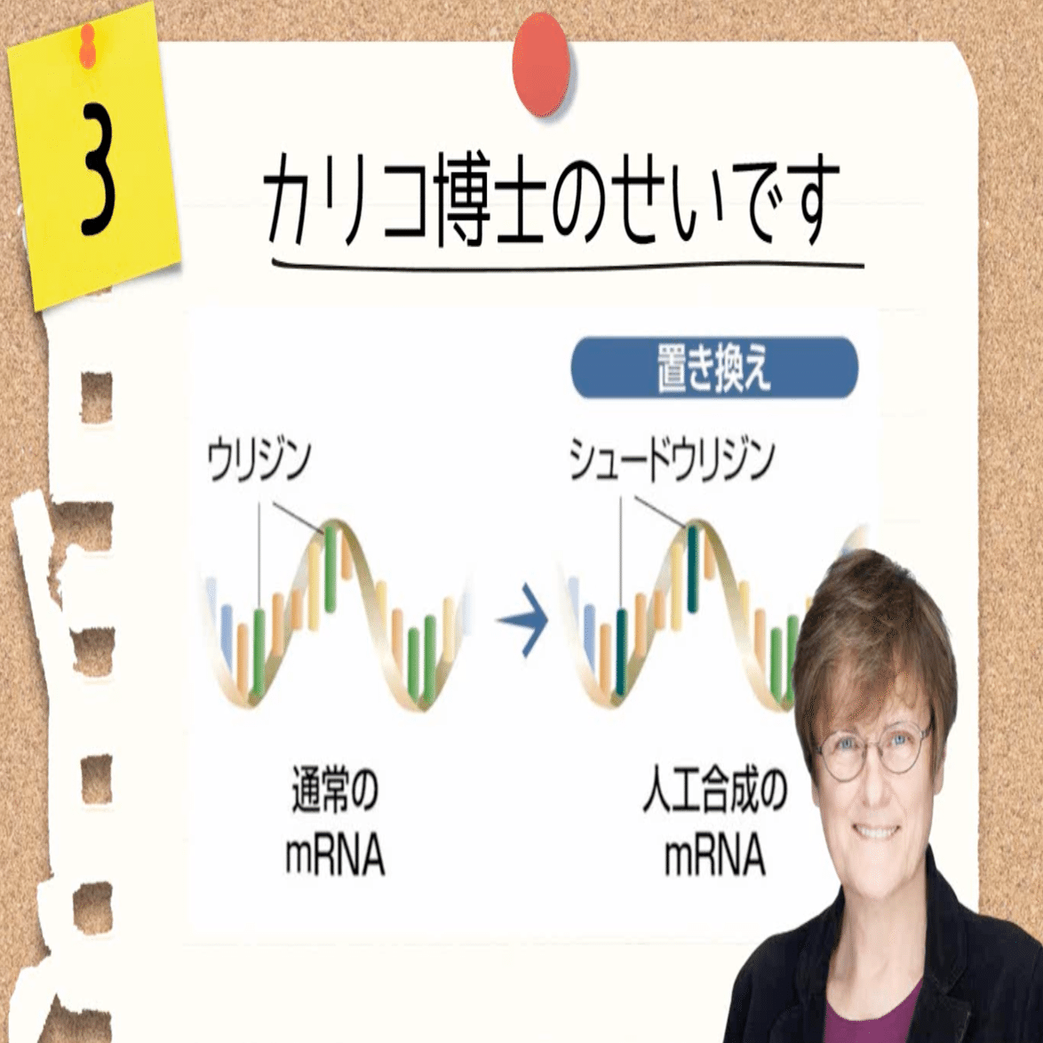 こんな言い方をしたら怒られるかもしれませんが、カリコ博士は通常のmRNAにあるウリジンという塩基を修飾して、シュードウリジンというものに置き換えました。
