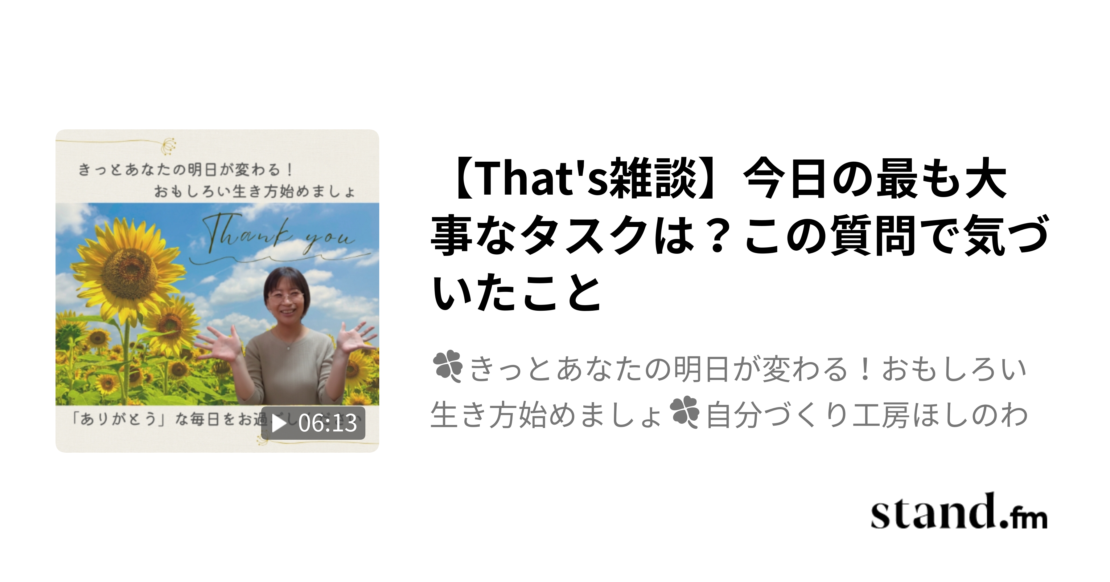 【That's雑談】今日の最も大事なタスクは?この質問で気づいたこと - 🍀きっとあなたの明日が変わる!おもしろい生き方始めましょ🍀自分づくり工房ほしのわ | stand.fm今日やることで頭がいっぱいの方必聴!優先順位がつけやすくなりますよ🥰 💫 「自分づくりの場 ほしのわ」ではこんなことをやっています! 📢♬無料メルマガ講座 自分らしいおもしろい生き方を始めるための「無料メルマガ講座」を やっています。ぜひ、ご登録ください🥰 https://hoshinowa8.com/mailmaga…stand.fm