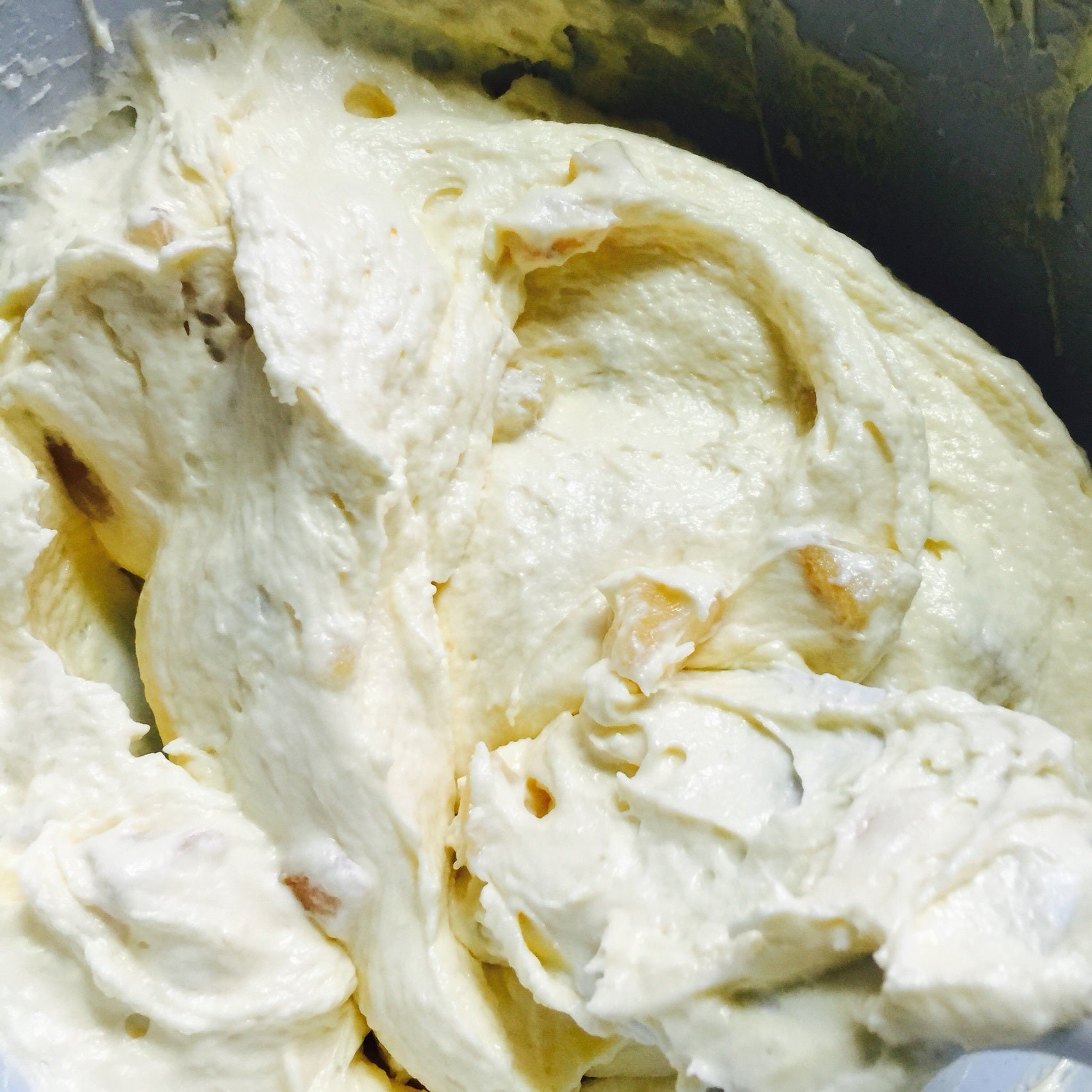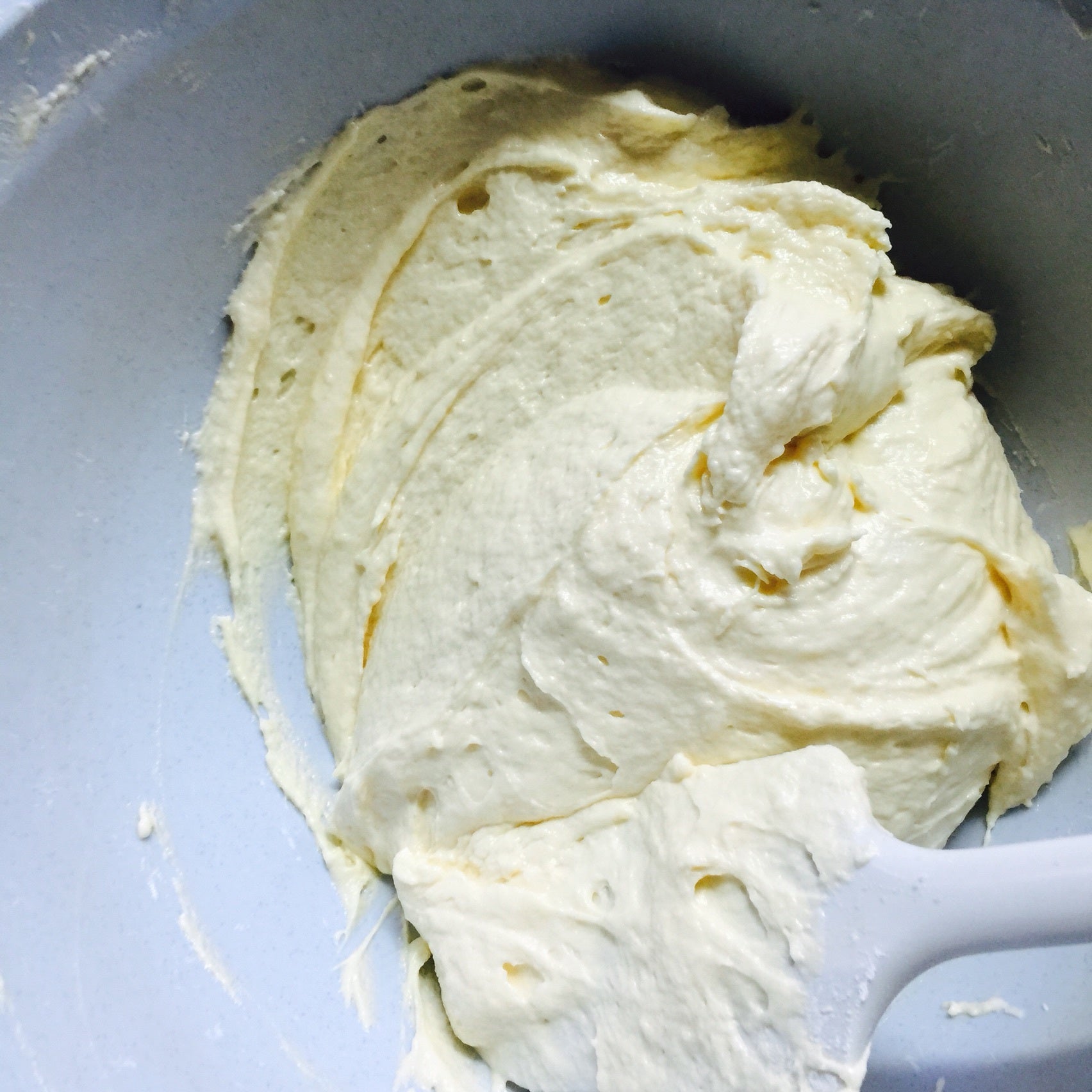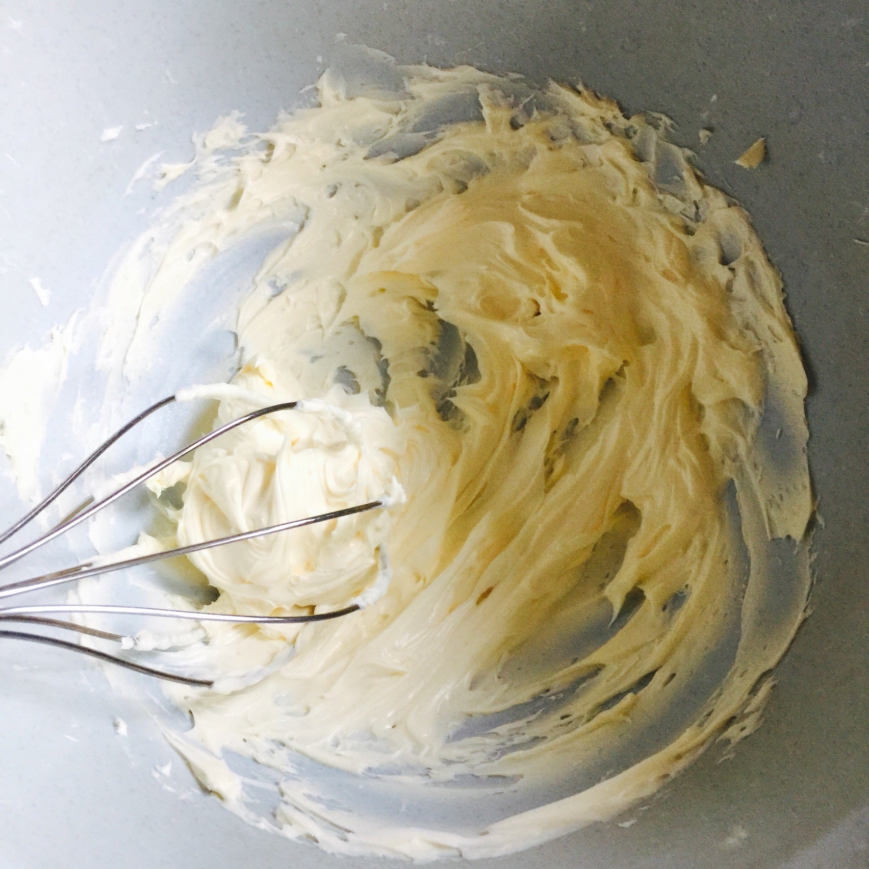 02製菓用マーガリンを泡立て器で混ぜ、クリームの用になるまで混ぜます。