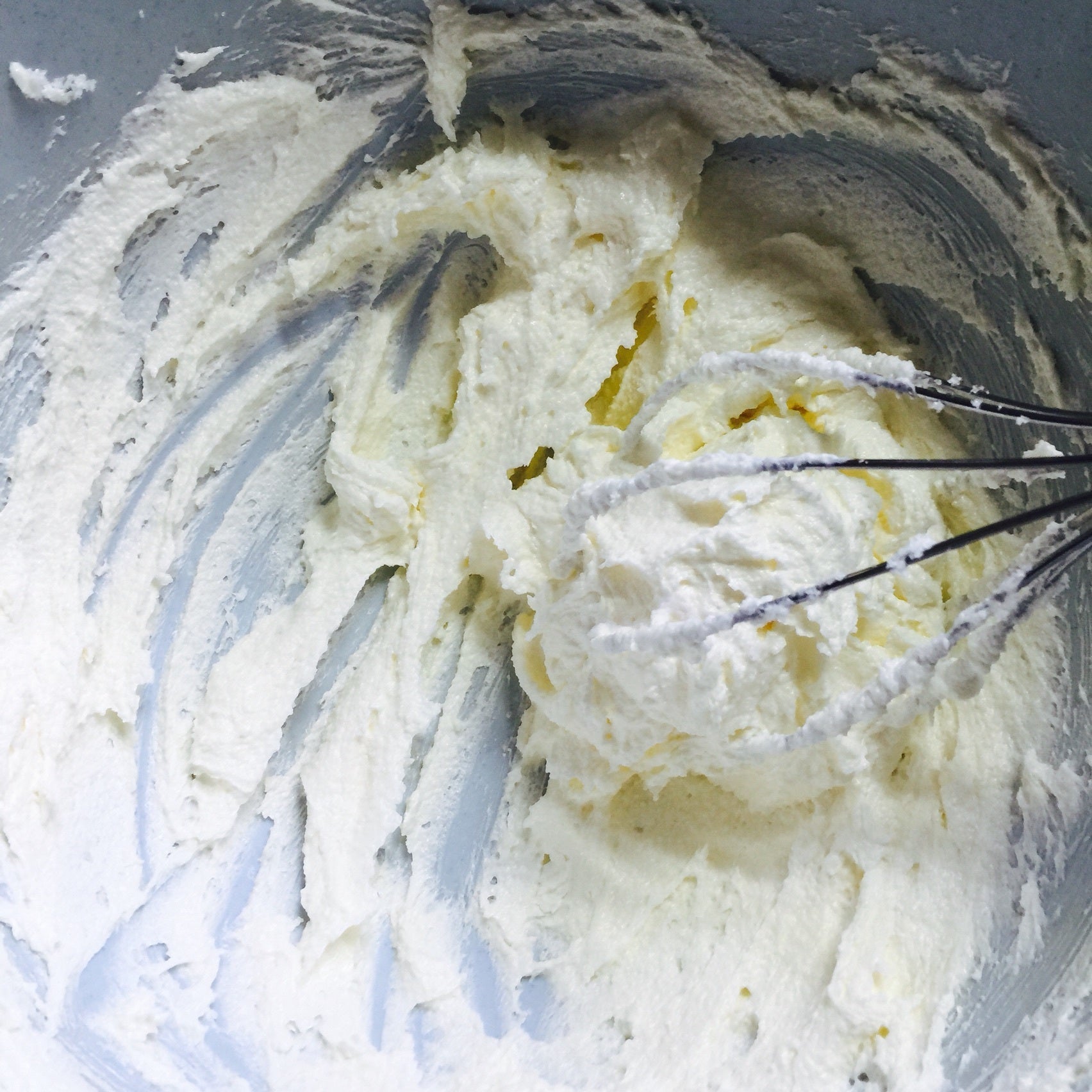 03クリーム状になったら砂糖を3~4回に分けて混ぜながら泡立て器でさらに混ぜます。白くてふわふわなクリームの様になるまで混ぜます。