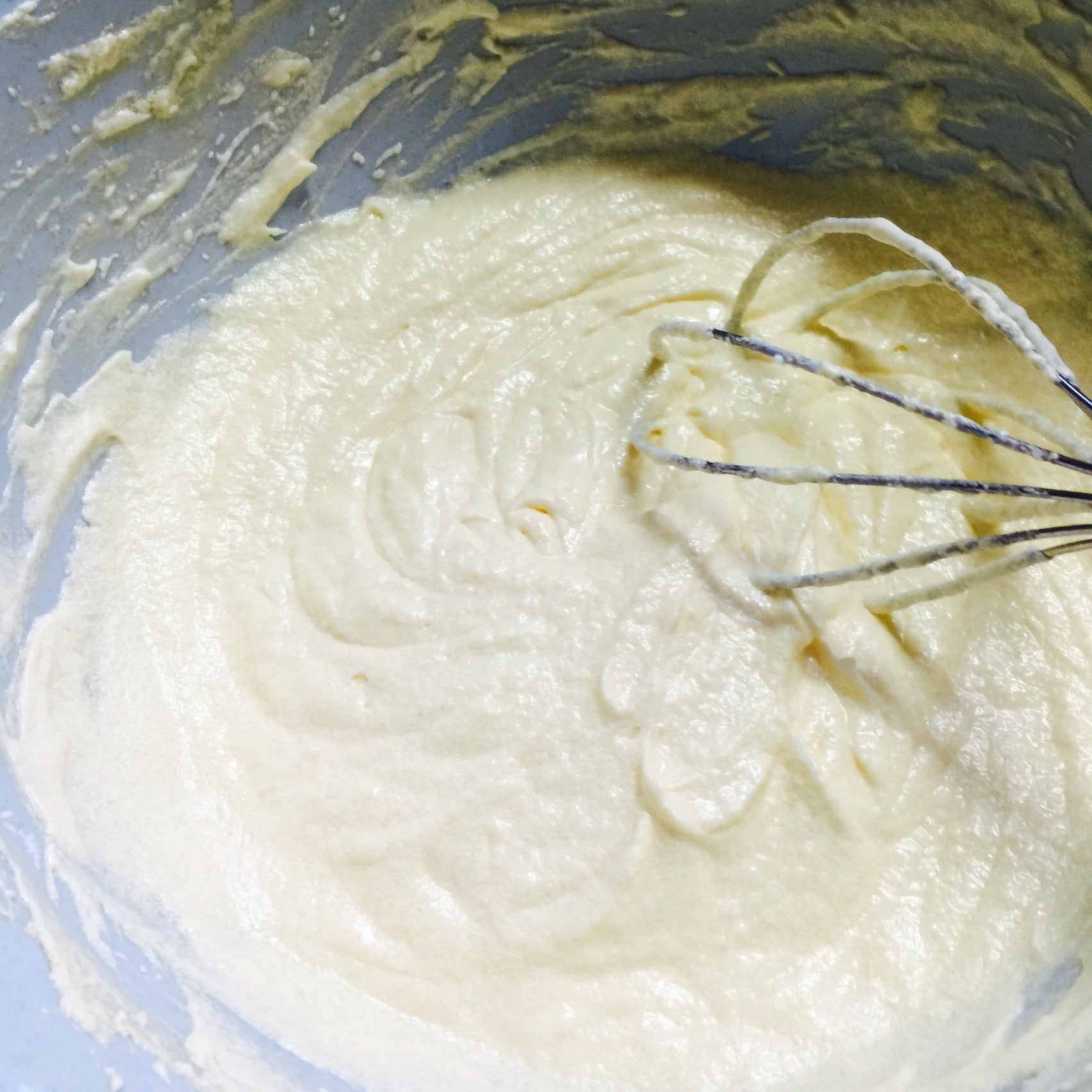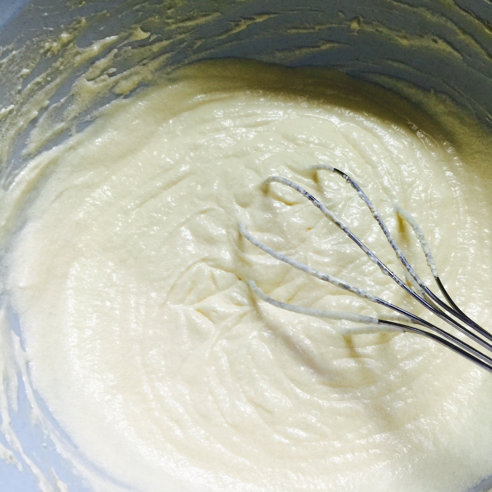 04白いクリーム状になったら、溶き卵を数回(私は5回に)に分けて泡立て器で混ぜます。ここで、卵の温度が低いと分離しますので注意です。分離しちゃった場合は慌てず、湯煎にかけながら分離を解消して下さいね。やりすぎ無い様にボウルの生地から目を離さないでね。