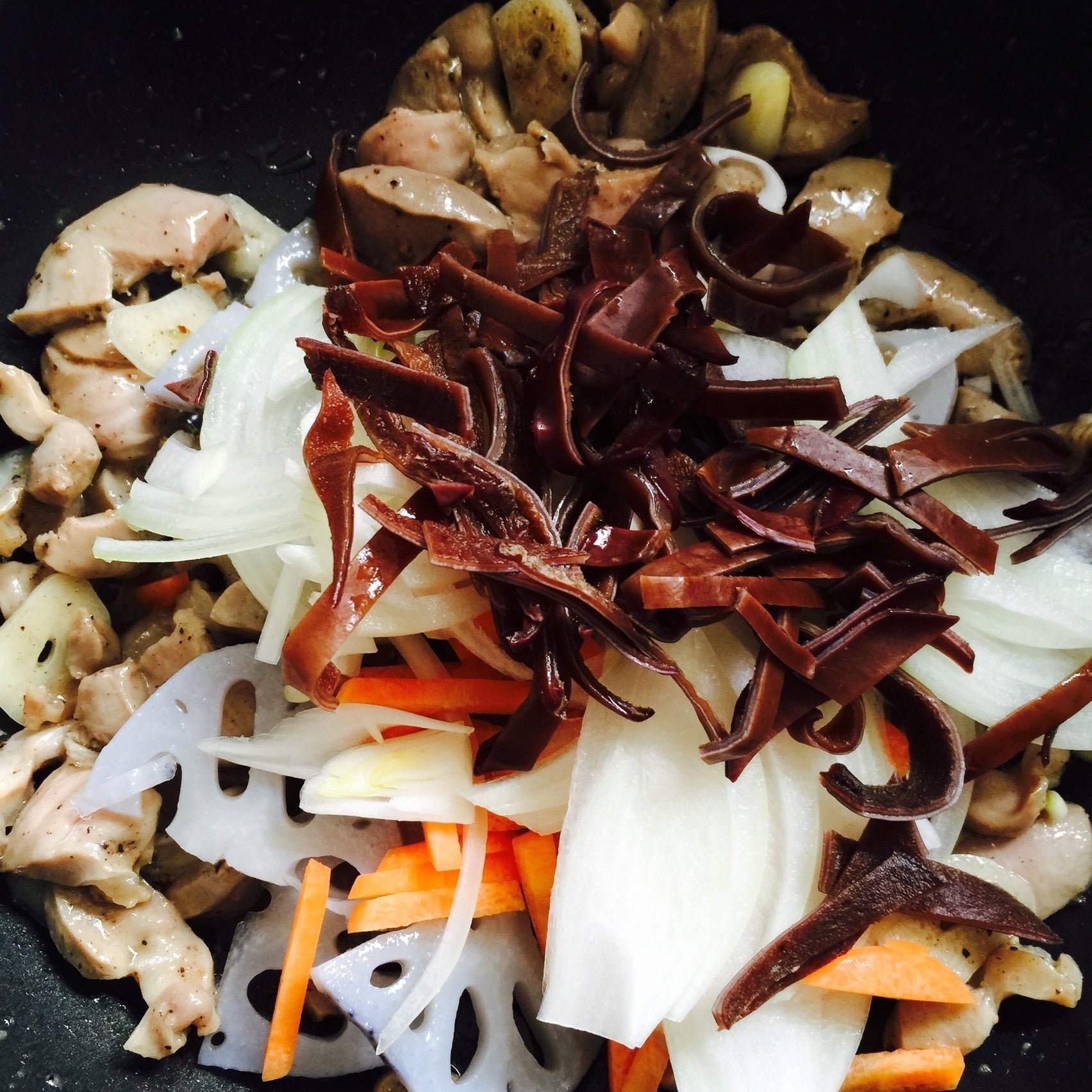 ⑤砂肝が色が変わる程度に炒めたら人参、キクラゲ、玉ねぎ、蓮根を入れて油が回る程度に炒めます。