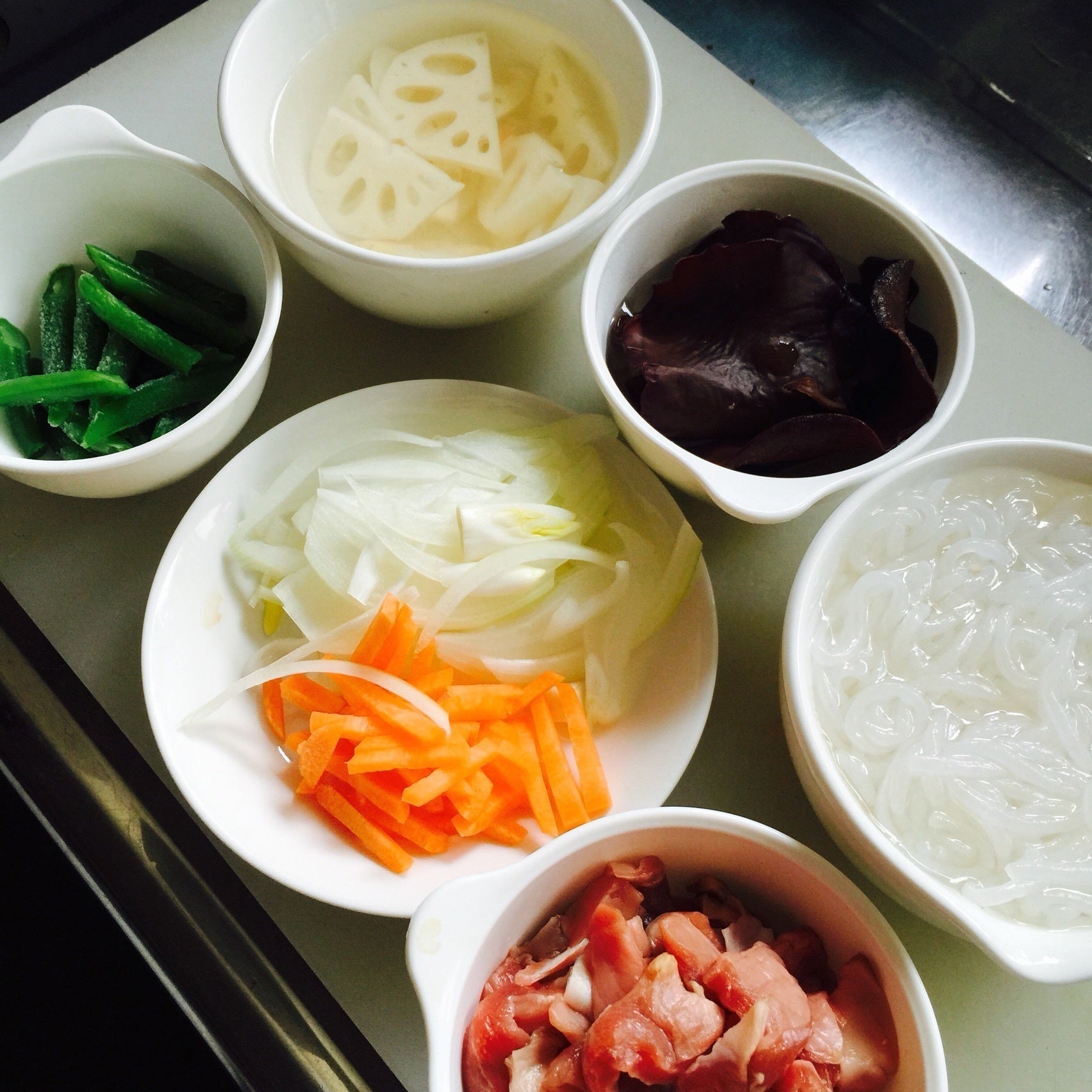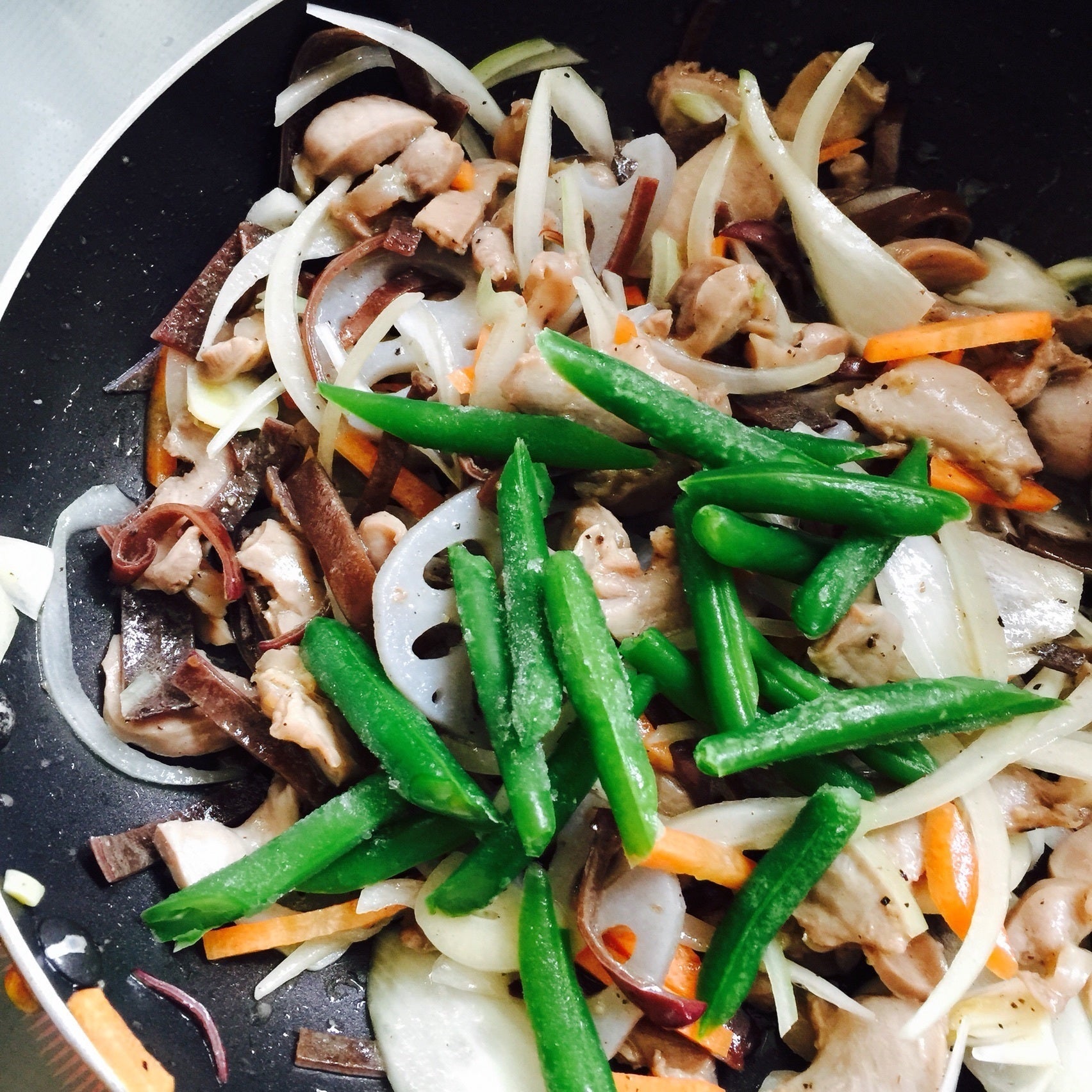 ①具材を切ります。キクラゲは湯で戻してから細切りにして、インゲンは食べやすいサイズにカット、玉ねぎは薄切り、人参も細切りにし蓮根は4~5mm幅の半月切りにします。砂肝も食べやすいサイズに切ります。