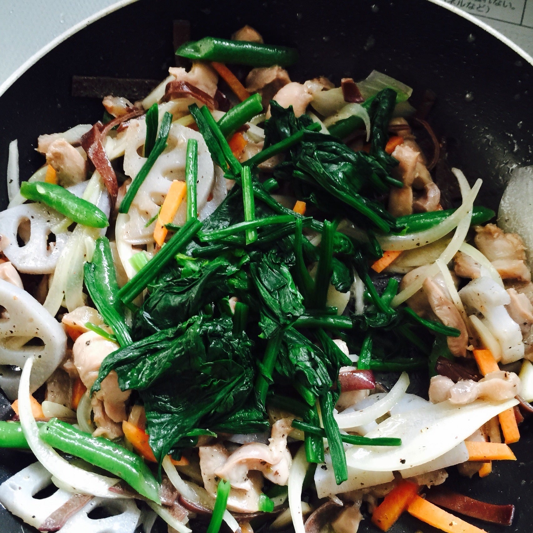 ⑨野菜を炒めていた同じフライパンに糸こんを入れ、軽く炒めたら合わせておいた調味料を加えて炒めます。1~2分煮込む様にしてから別に置いてあった炒めた野菜を投入して絡ませる様に炒めて出来上がりです。味見をしてピンとこなかったら塩を足してみてね♡