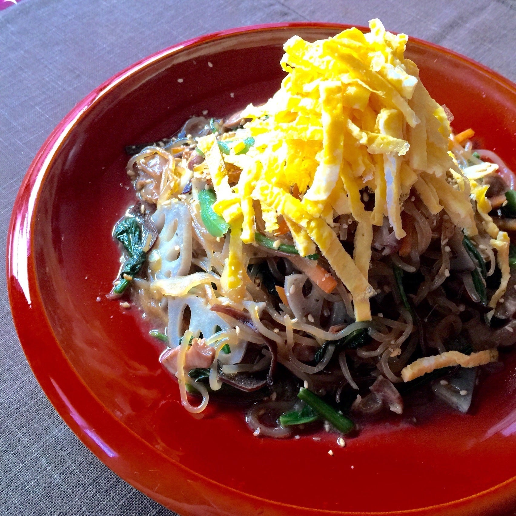 全体的に野菜が少ないんですけど、どうにかしなくちゃ、ってことで、沢山もらったほうれん草と玉ねぎ、人参を使ってチャプチェに。