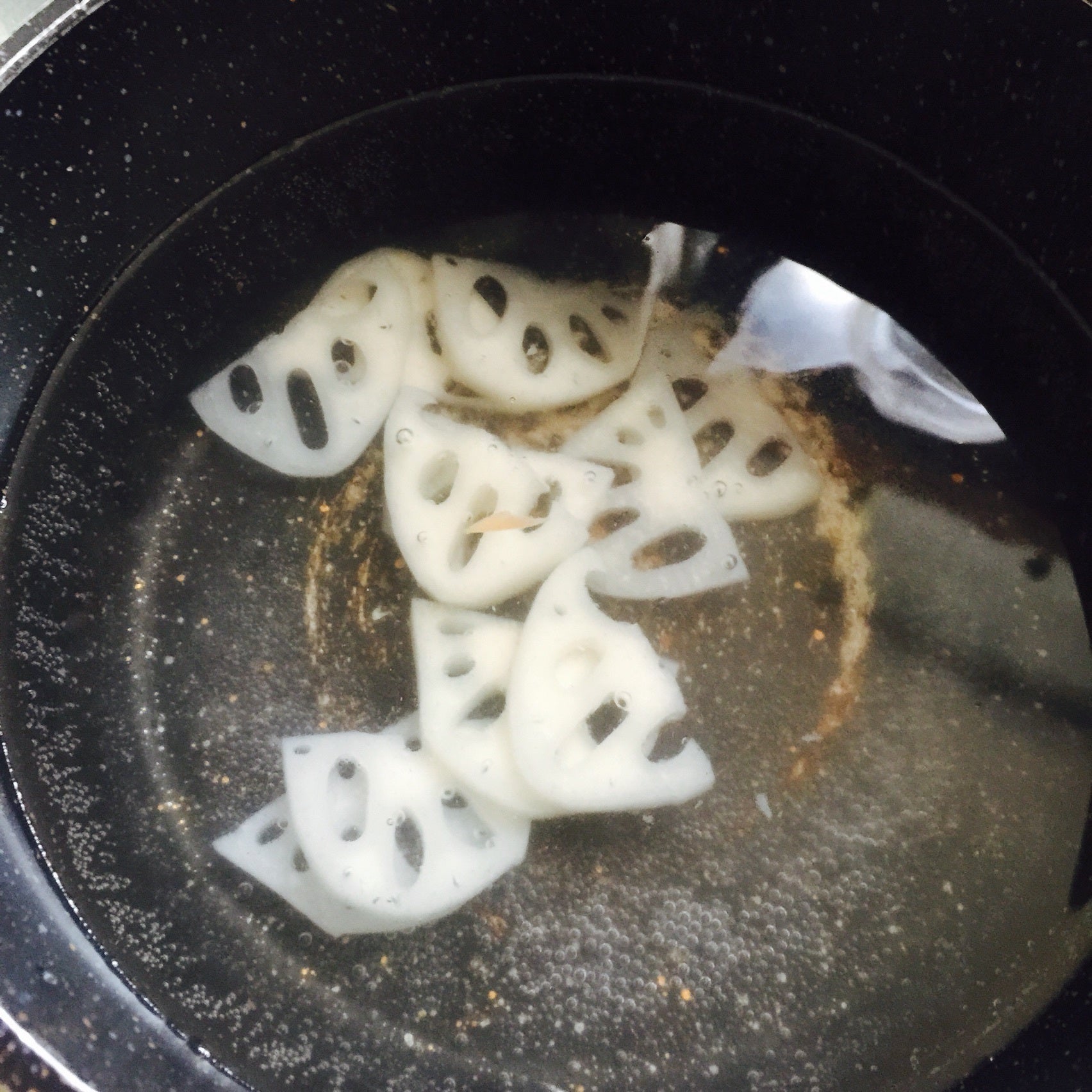 ③蓮根は酢水につけて変色しない様にして、軽く茹でます。茹でる際もお湯に酢(分量外)を入れて茹でると変色しにくいです。