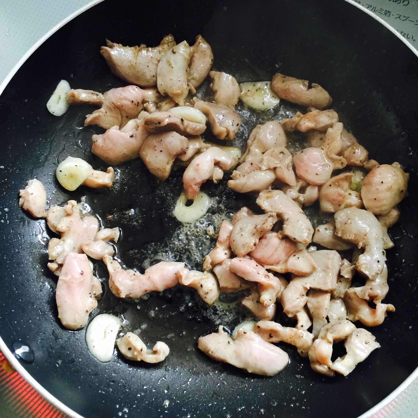 ④フライパンにニンニクと砂肝を入れて炒めます。ここでしっかりと塩胡椒します。そして出来たら粗挽き胡椒が理想的です。
