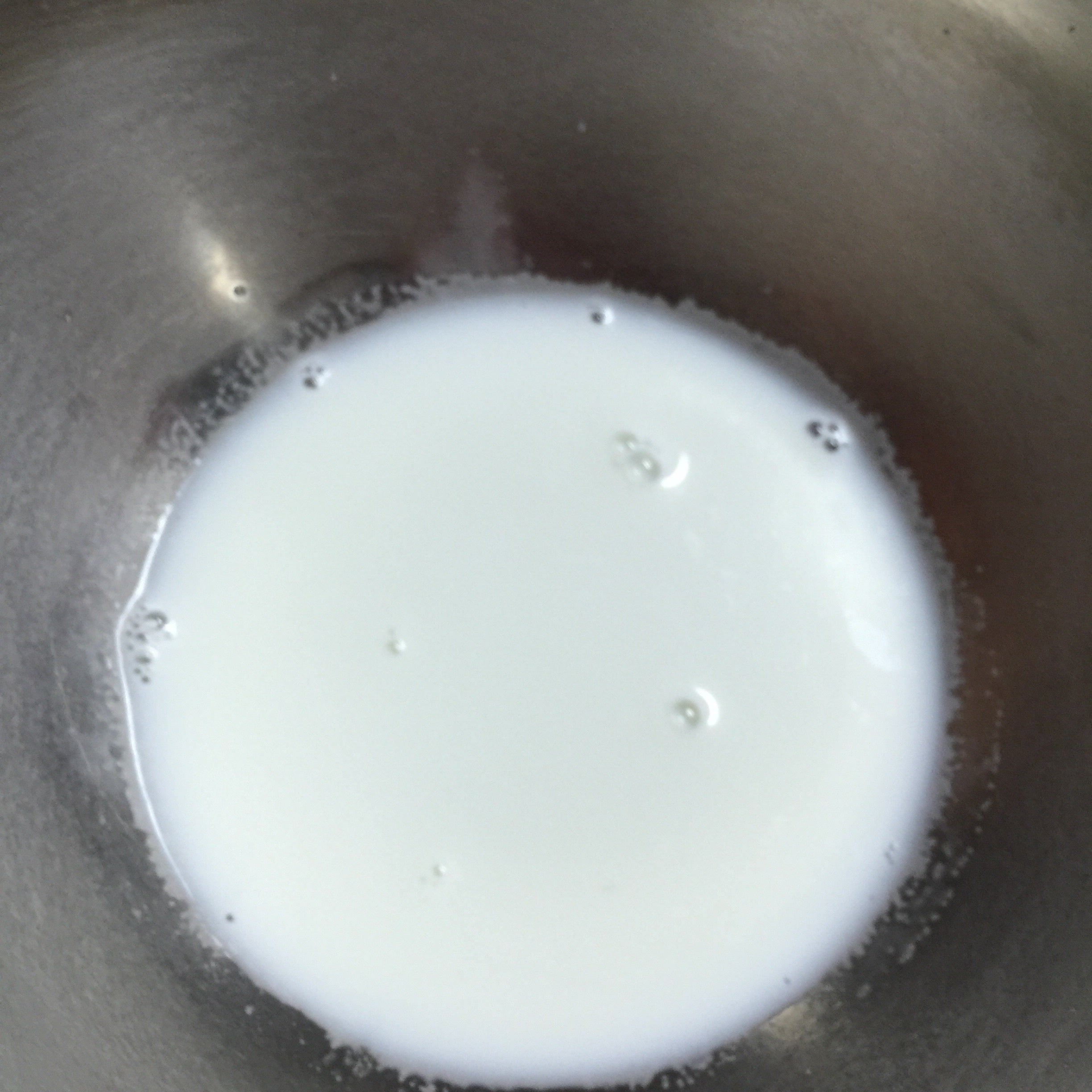 ③牛乳を耐熱容器に入れてレンジで60℃ぐらいまで温めます。あたたまったらボウルに移し変えます。