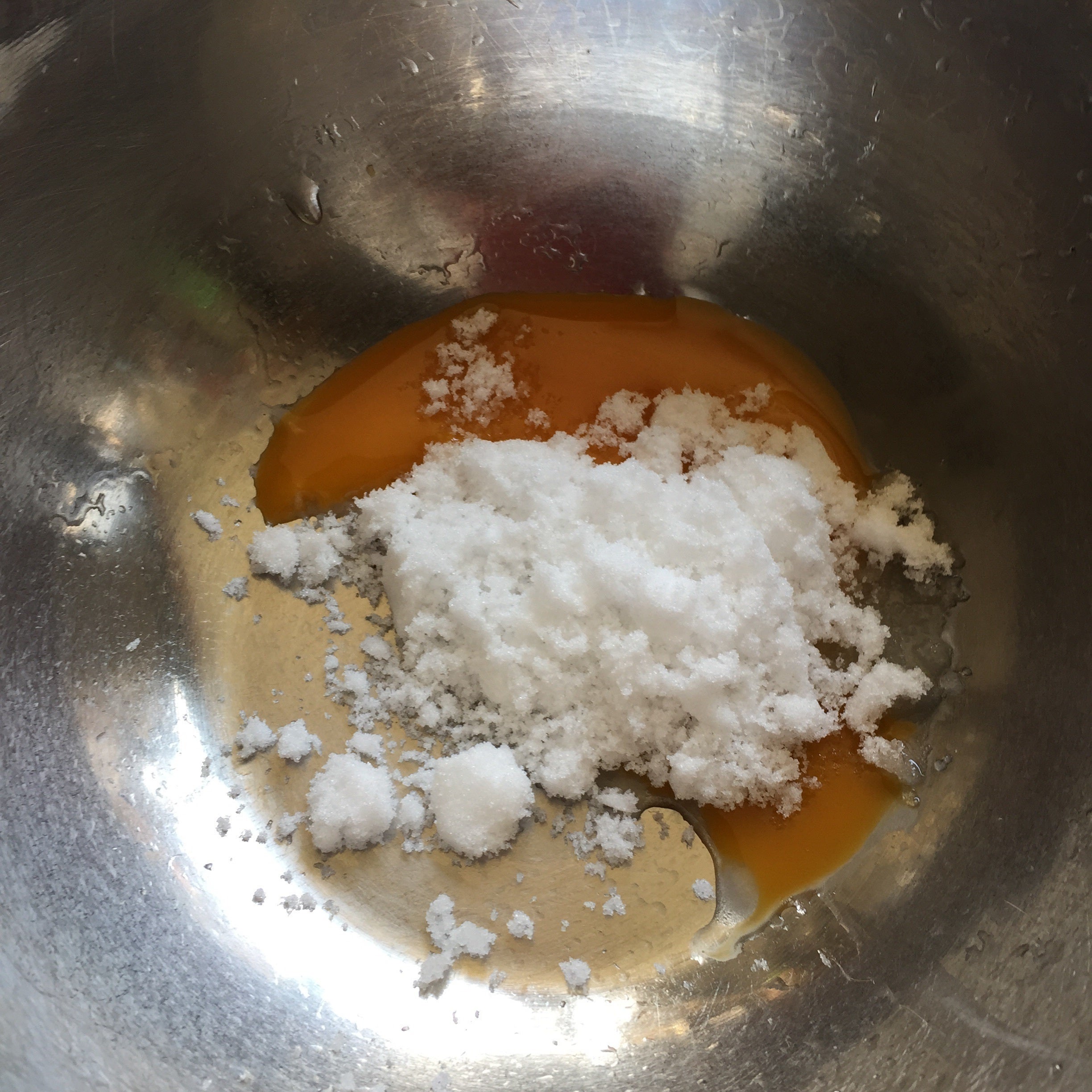 ②卵黄にグラニュー糖、なければ砂糖を加えます。