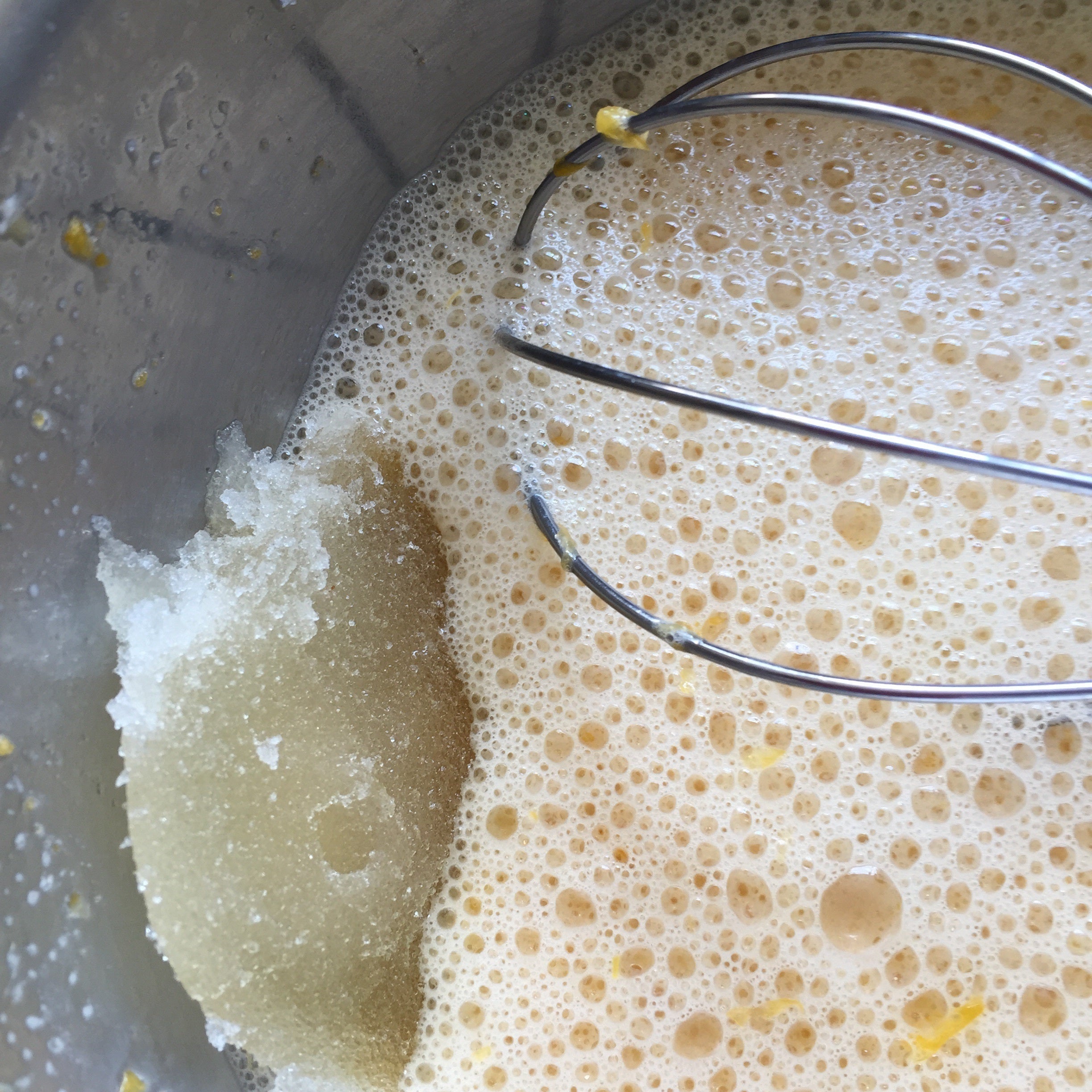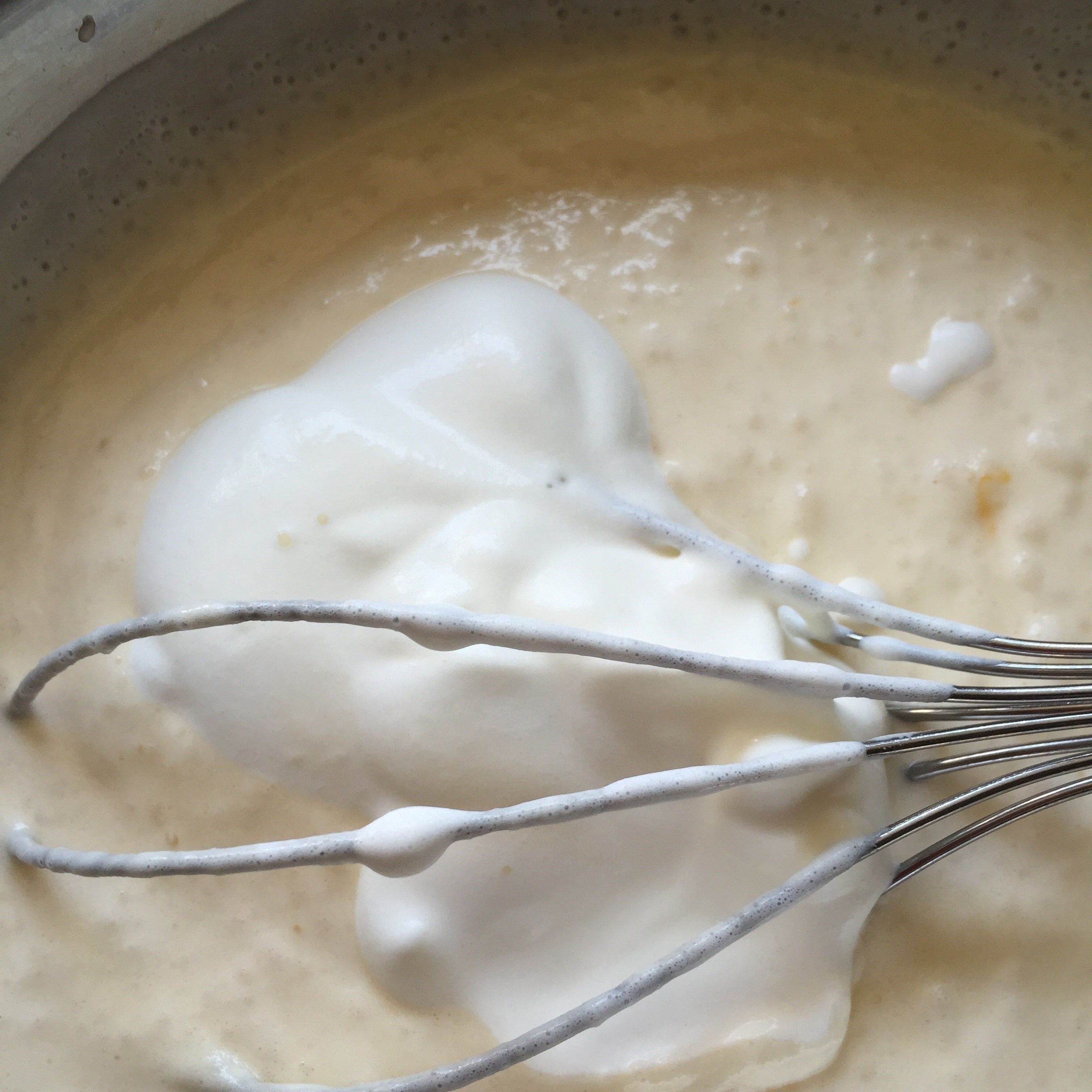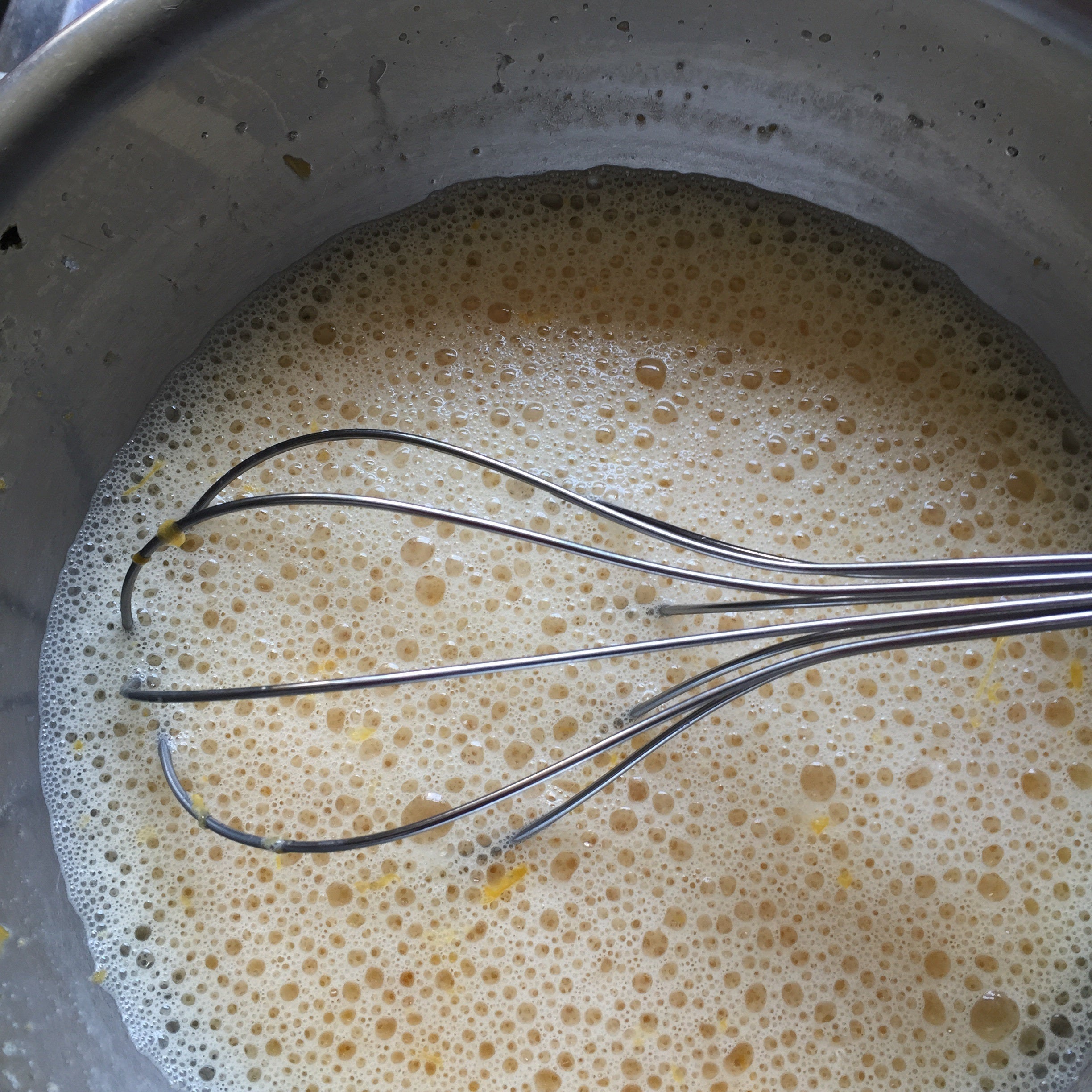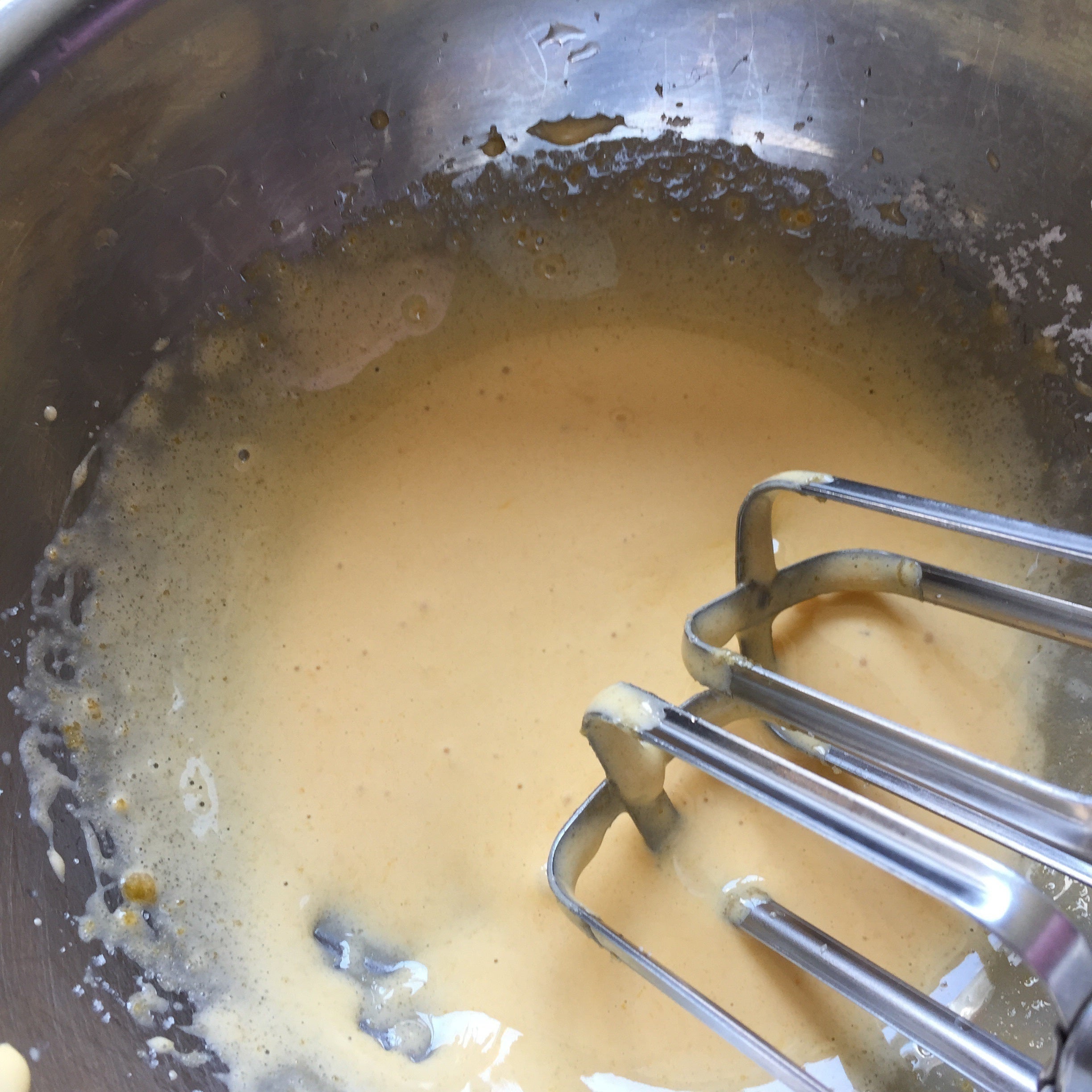 ③卵黄がもったりとするまで泡立て器で泡立てます。