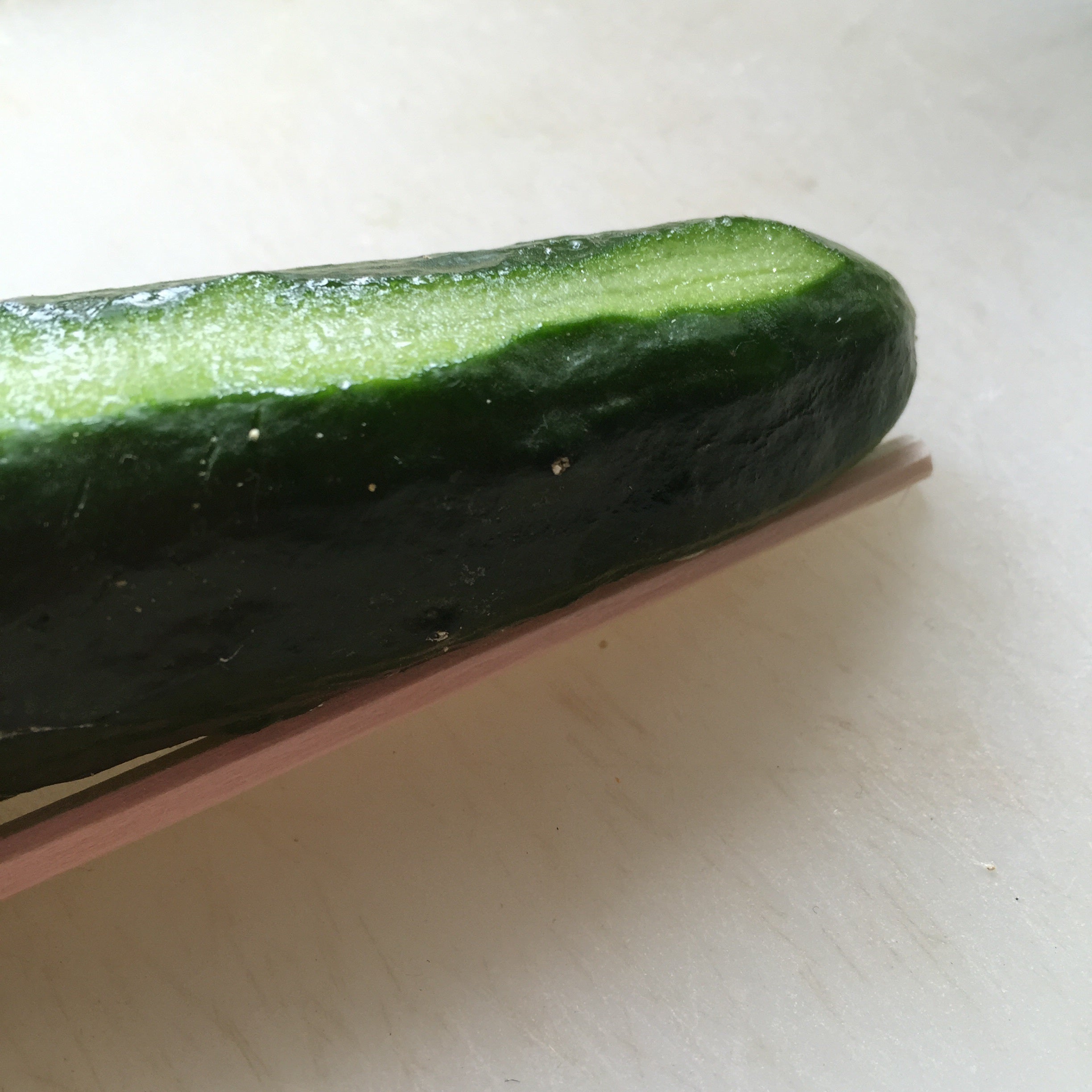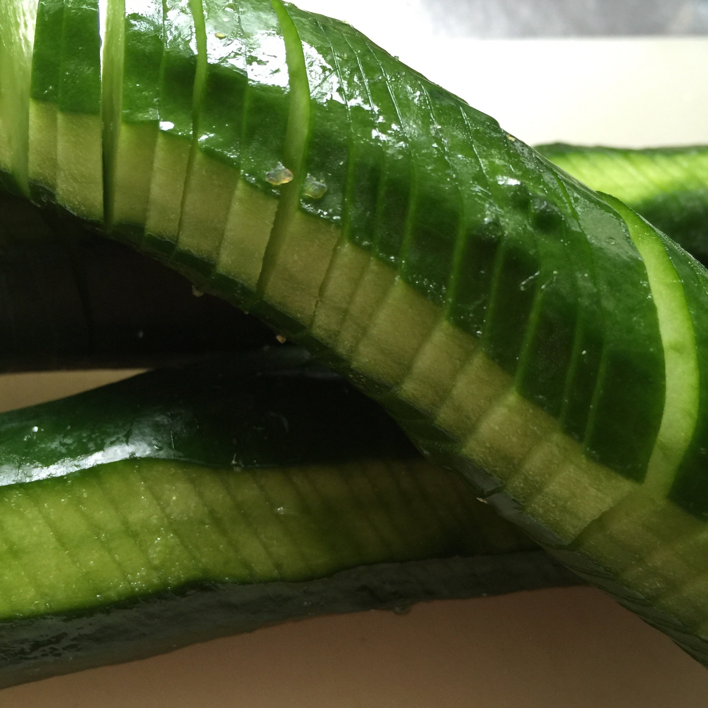①きゅうりを縦にピューラーで2箇所皮をむき、蛇腹切りにします。きゅうりのサイドに割り箸を置いて包丁を当てる様に切ると蛇腹にしやすいです。