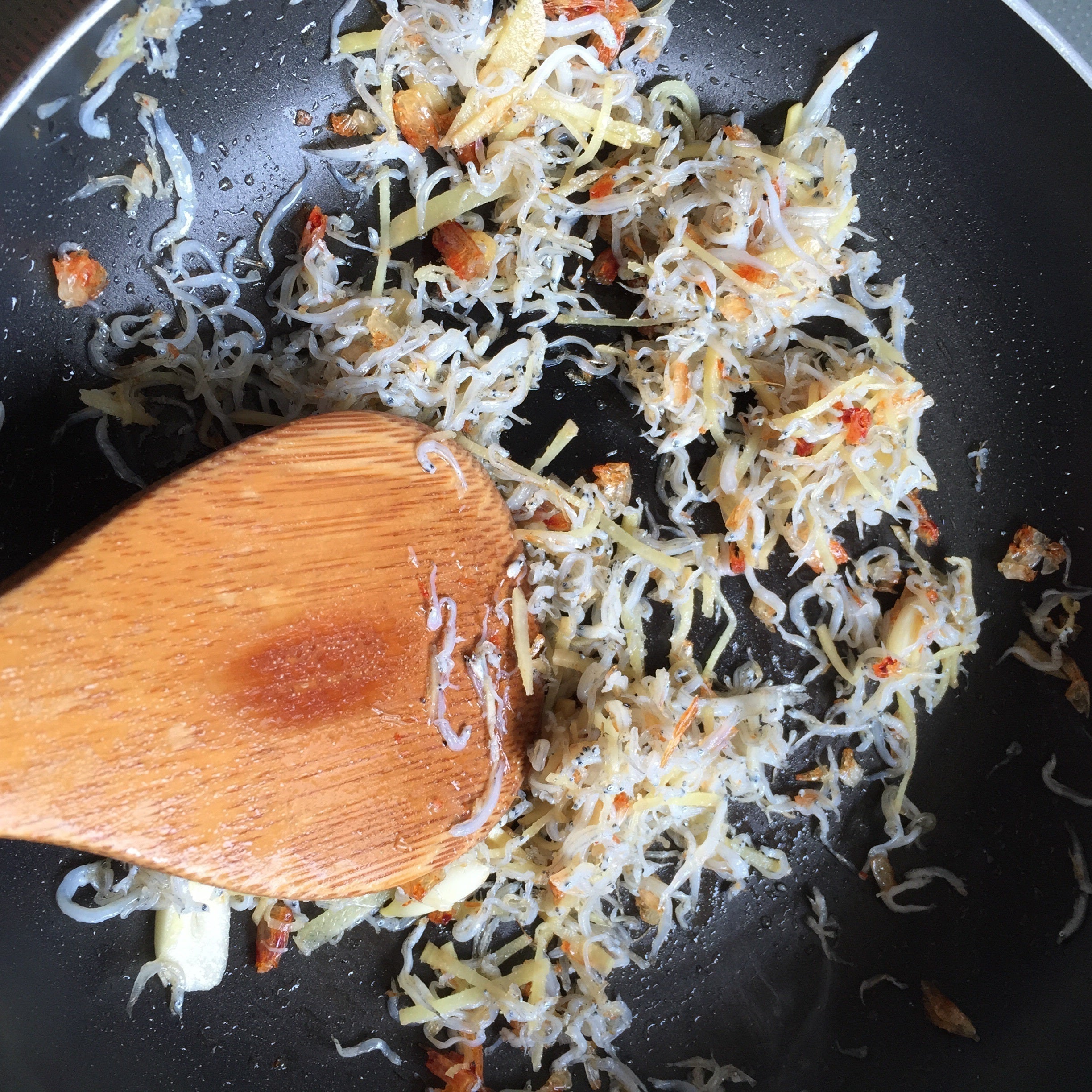 ④フライパンにごま油、針生姜、ニンニクのスライス、ジャコ、桜エビを入れて軽く炒めます。
