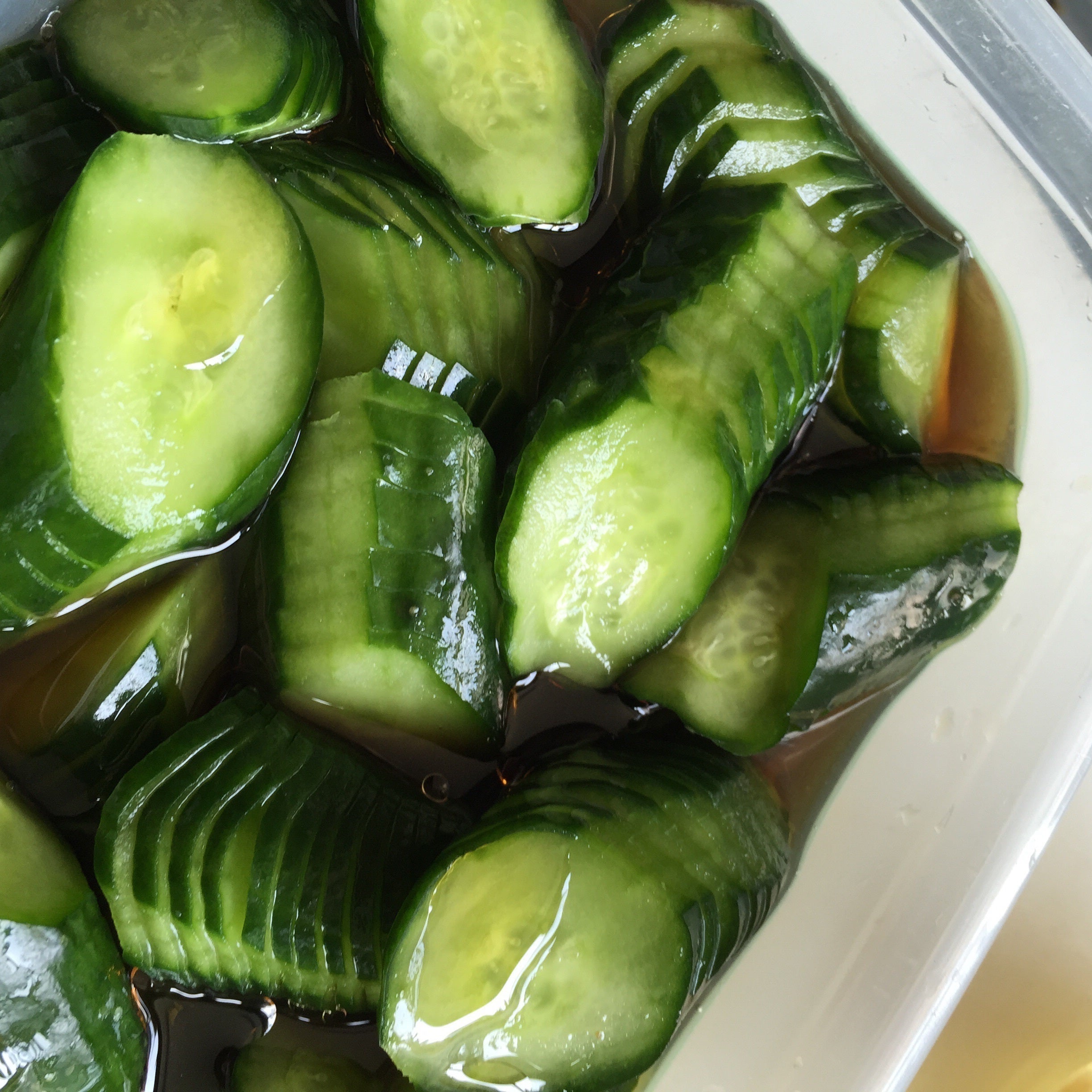 ⑤めんつゆ、水、酢を混ぜて容器に入れます。良く混ぜたら水気を切ったきゅうりを入れます。