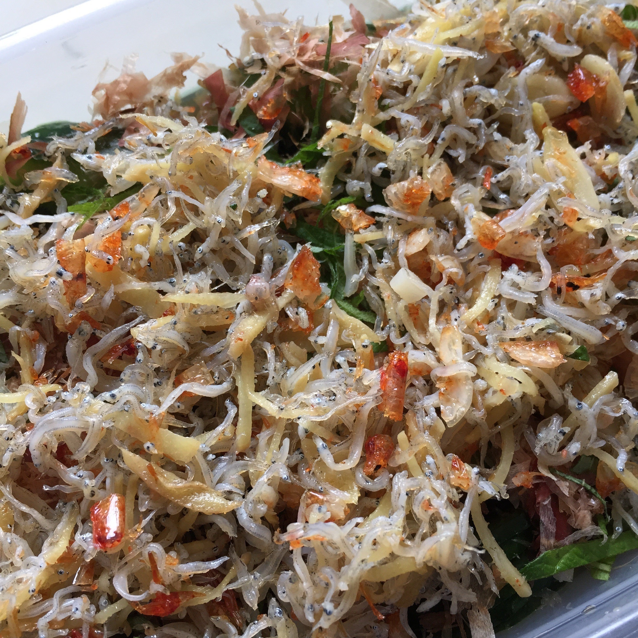 ⑦炒めたジャコなどを更に上にのせて蓋をして冷蔵庫で3~4時間冷やしたら出来上りです。