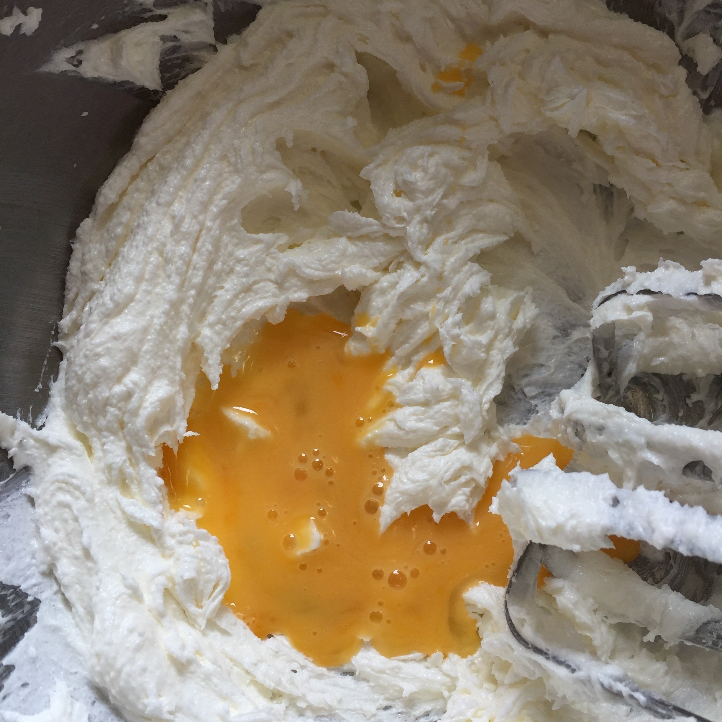 ⑤ふわっとした生地になったら室温に戻した卵を3回に分けて1回1回良く混ぜます。ここで卵が室温に戻っていないと分離してしまうので、注意して下さい。もし、分離してしまった場合はレンジで10秒程かけて良く泡立て器で混ぜる、10秒程かけて泡立て器をかける、と繰り返して見て下さい。2回目ぐらいには分離がかなり落ち着いてくると思います。