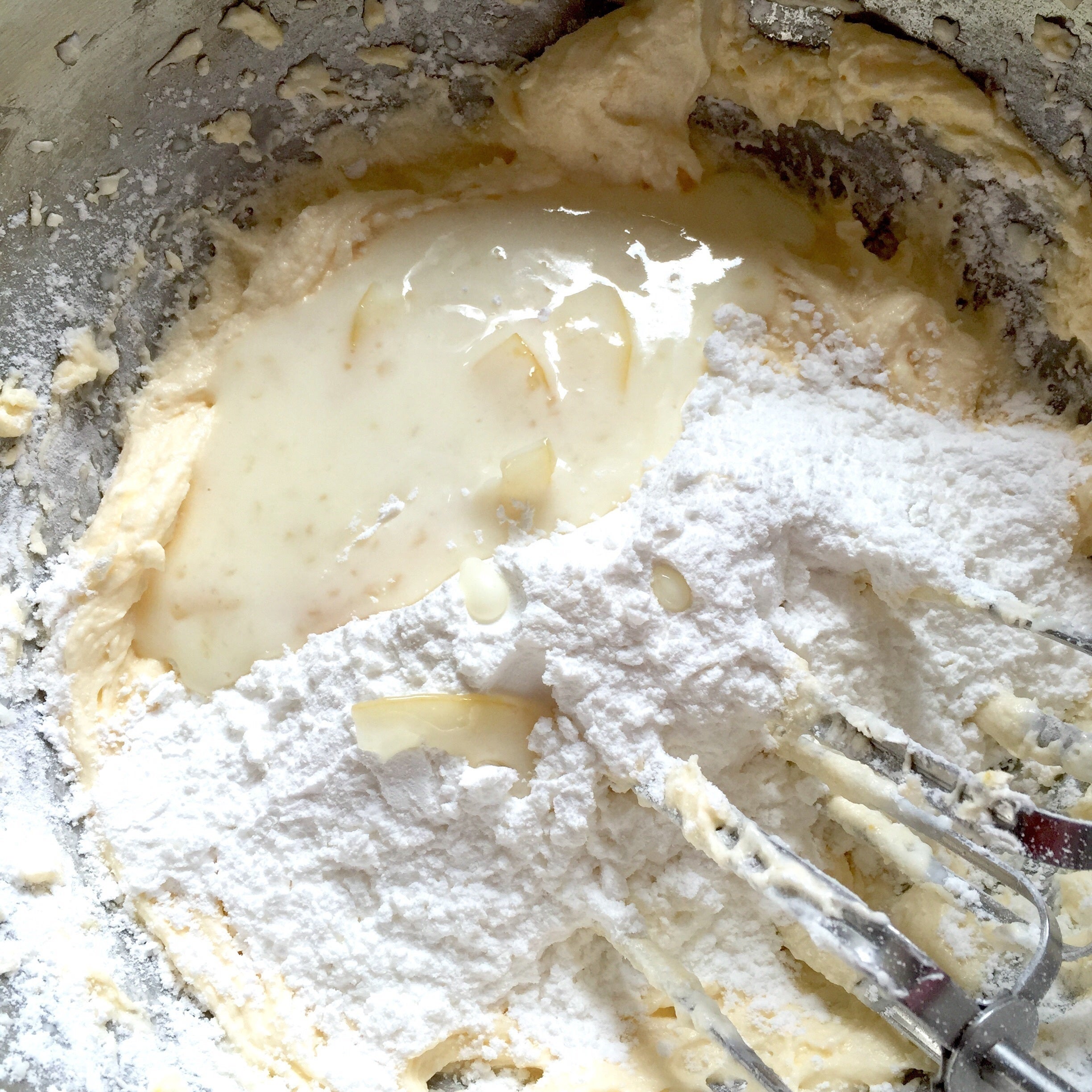 ⑦そこへふるった粉類の半量と、レモンの果汁等を混ぜたものを半量入れて混ぜます。更に残りの粉類を入れて、レモン果汁等の残りも入れて混ぜます。