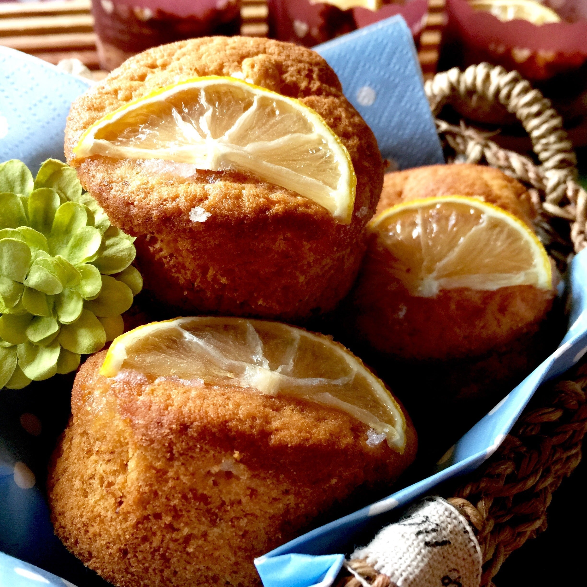 10)デコレーションにレモンのスライスを乗せて焼く場合はレモンのスライスの片面に砂糖をまぶし、マフィンを焼き始めてから20分たった所でオーブンを開けて、砂糖をまぶした面を生地と合わせてから再度焼けば出来上がりです。
