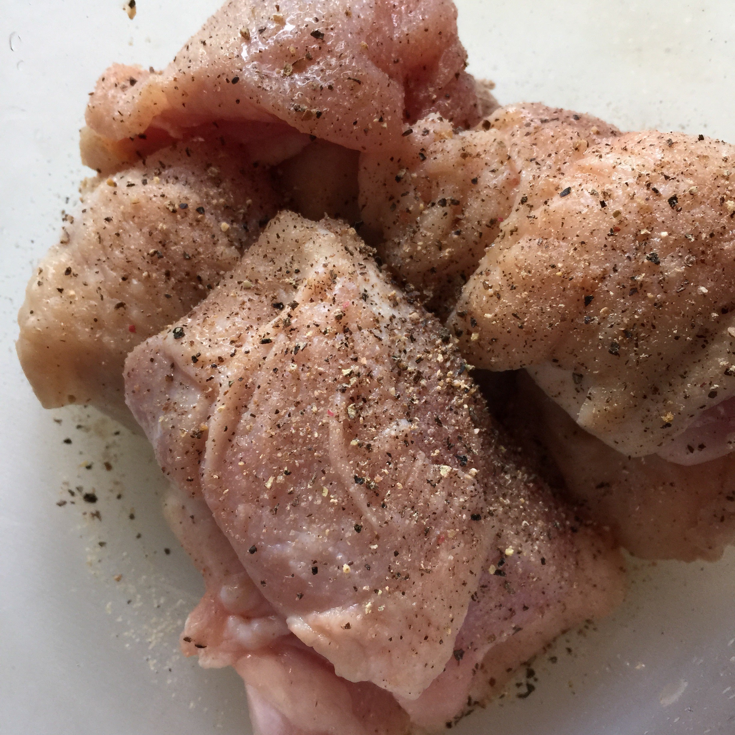 ②塩胡椒、粗挽き黒胡椒を入れて良く揉み込みます。