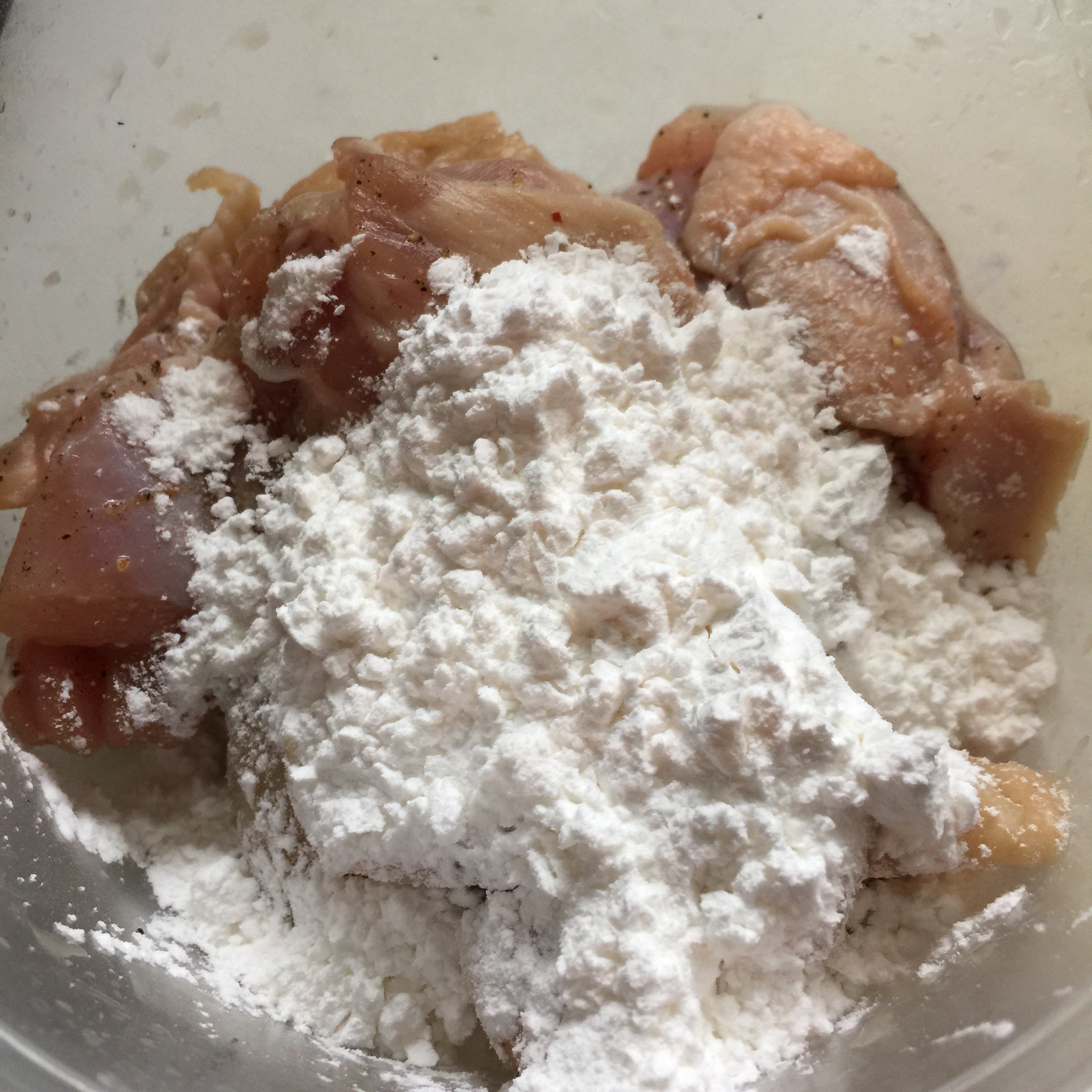 ⑤揚げる直前に米粉を鶏もも肉にしっかりと合わせます。