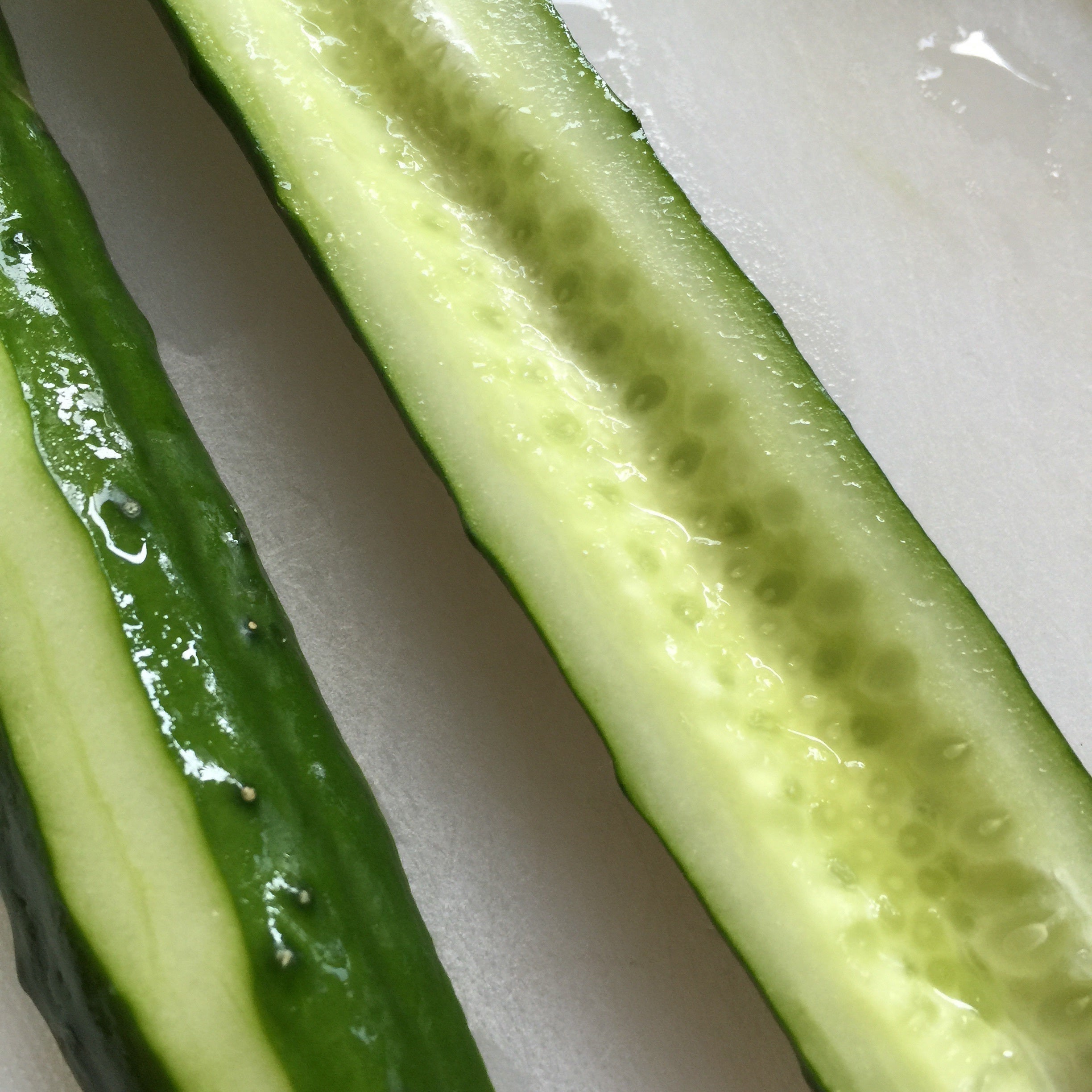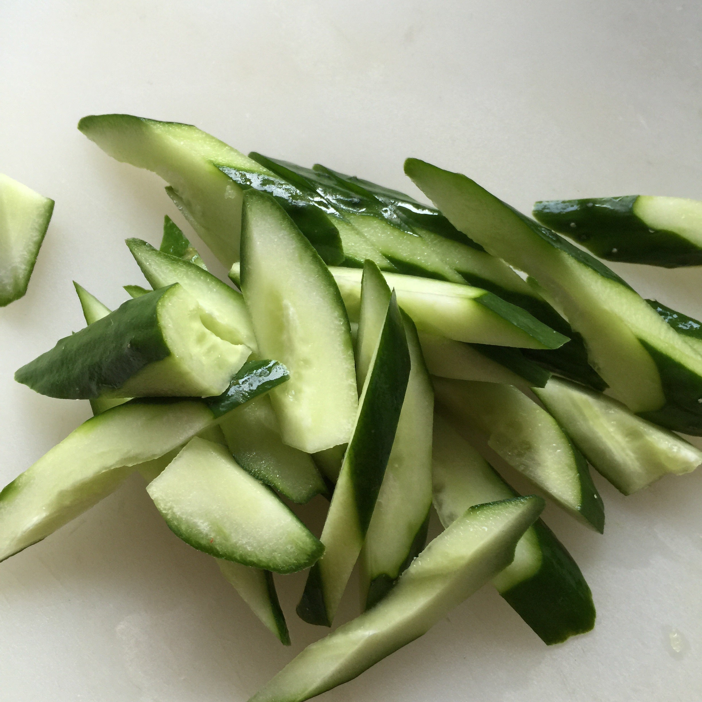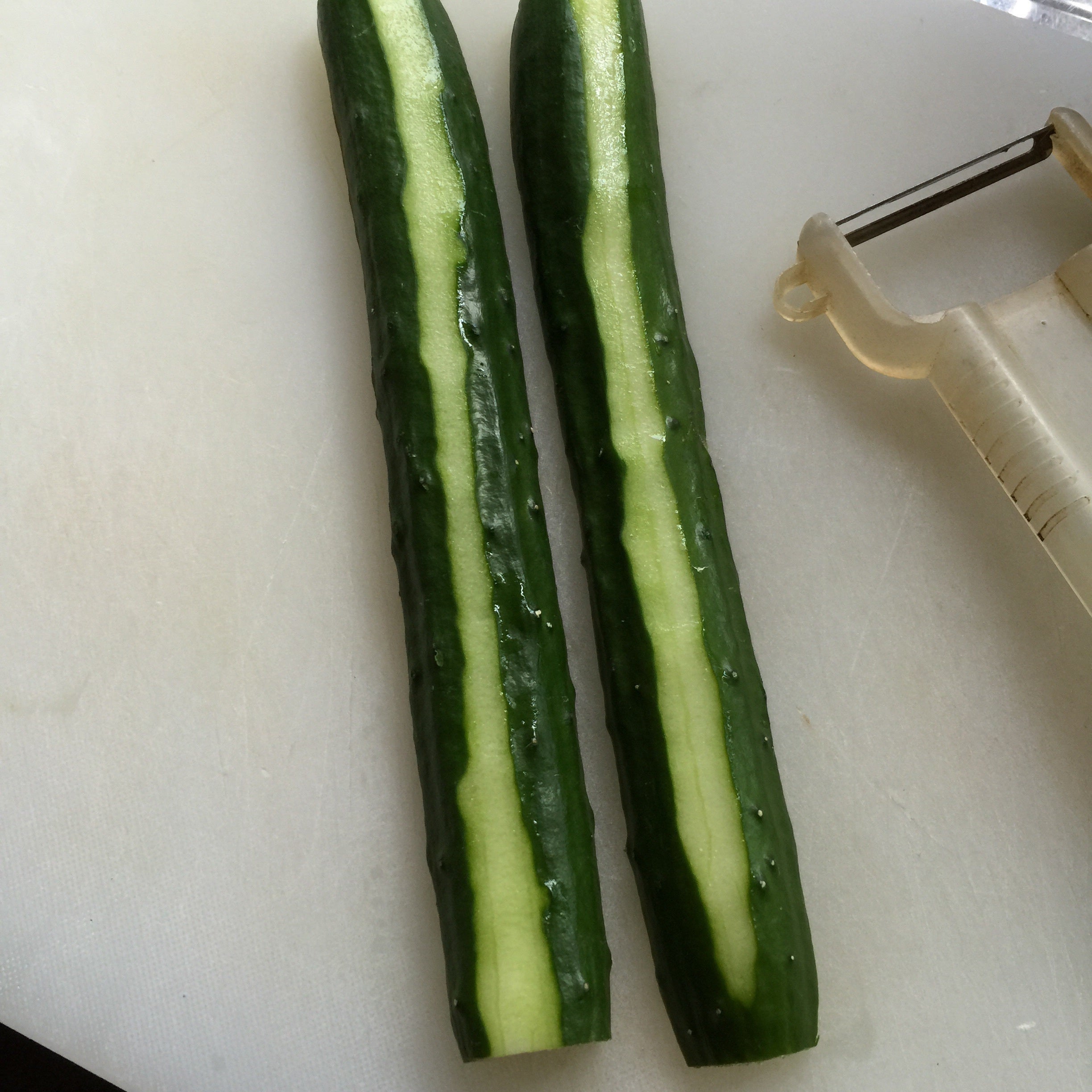 ①きゅうりをピューラーで2本分皮をむき、縦に切ります。