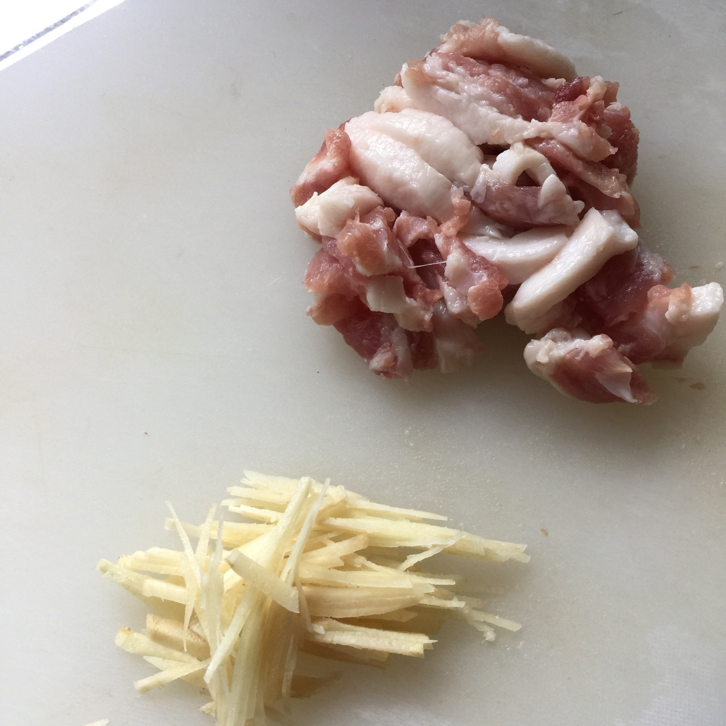 ④豚肉のブロックを少し厚めにスライスし、生姜をスライスします。