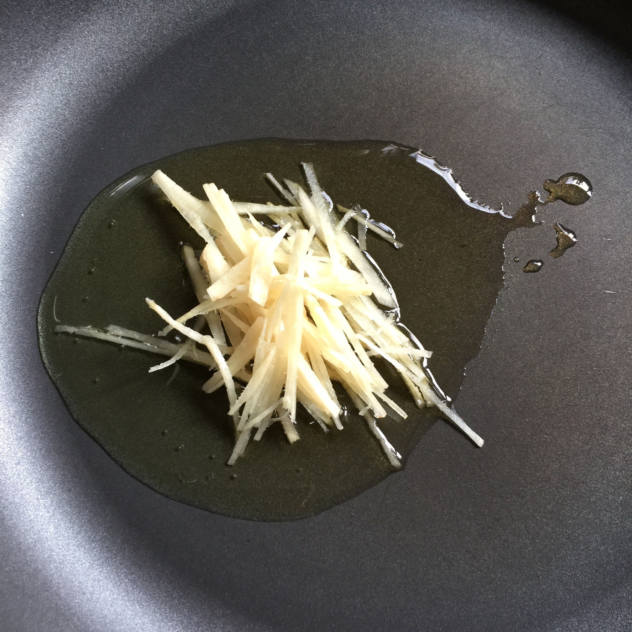 ⑤フライパンを中火で熱しなからサラダ油を入れ、生姜を投入します。生姜の香りがするまで炒めます。