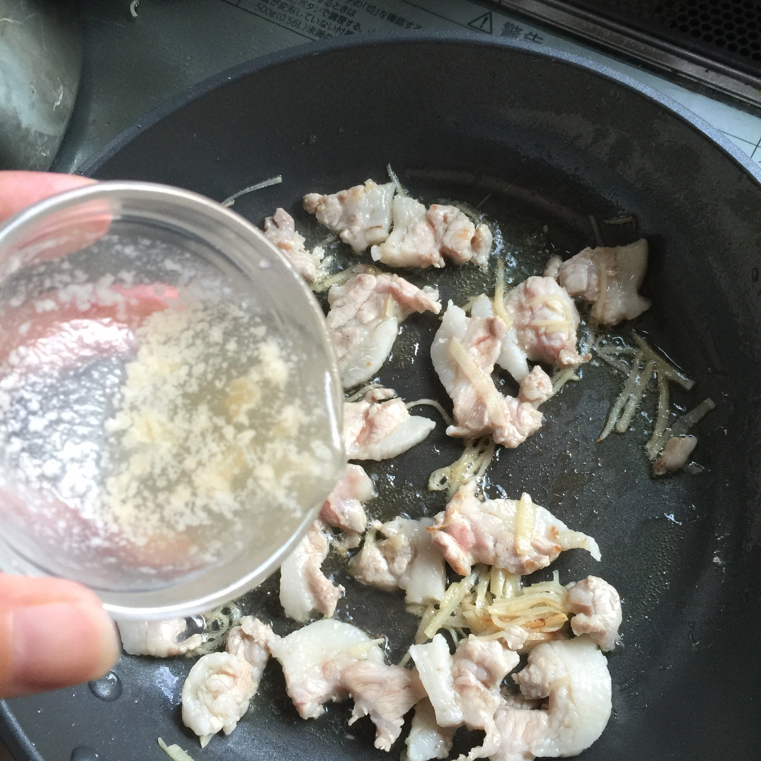 ⑦豚肉が両面白くなったら鶏ガラスープを入れて軽く混ぜながら炒めます。