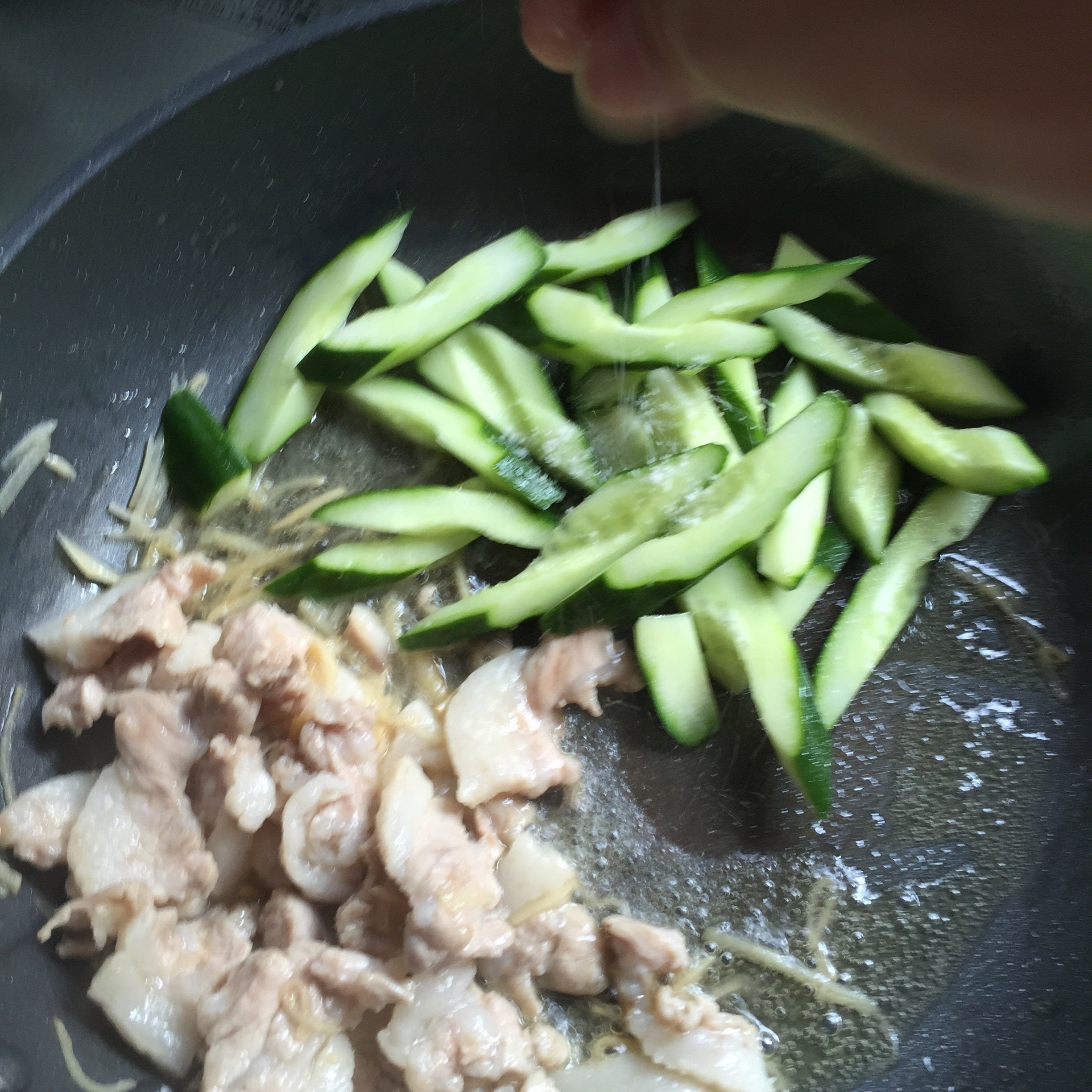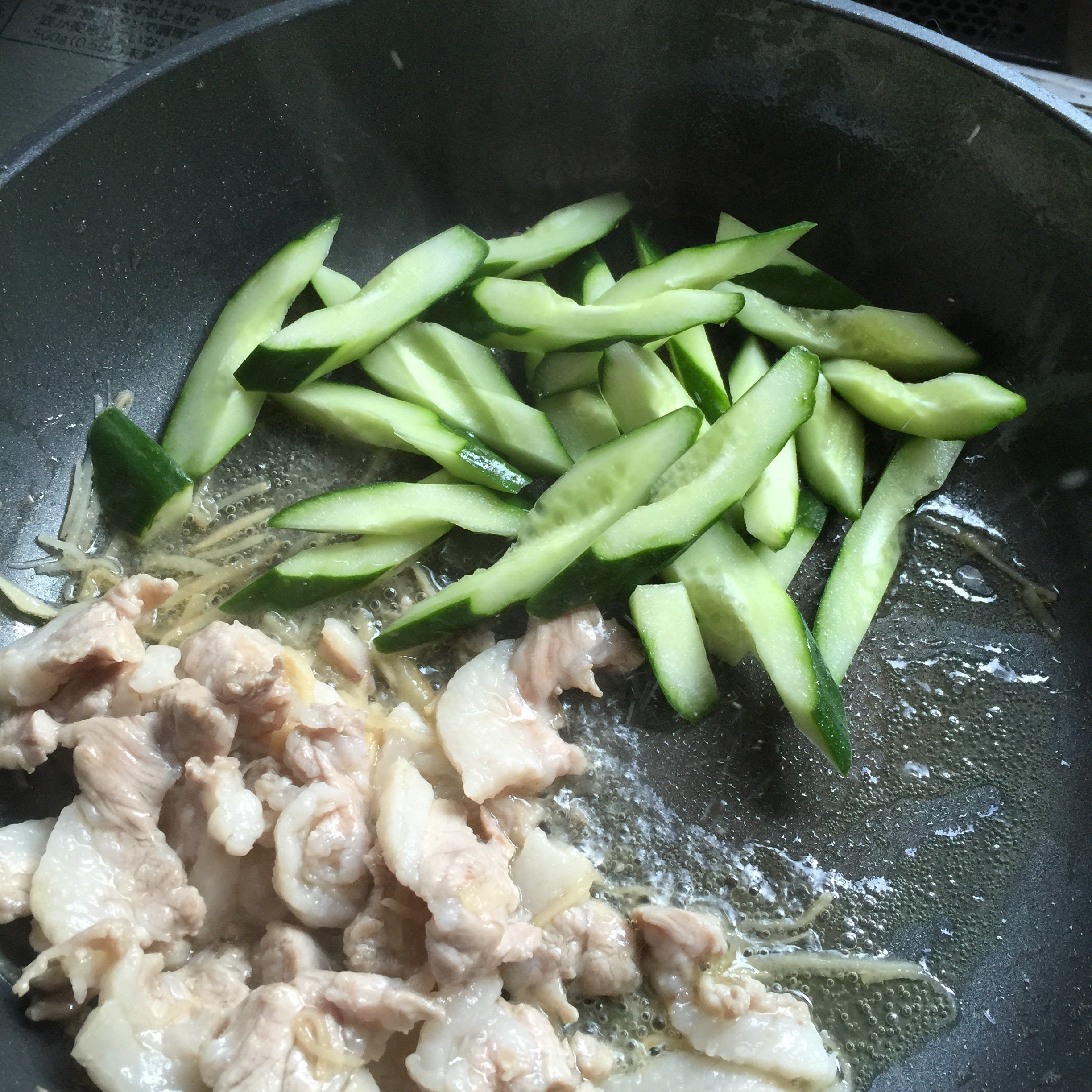 ⑧豚肉に赤身の色が完全になくなったら豚肉を片側に寄せて開いた所へきゅうりを投入します。