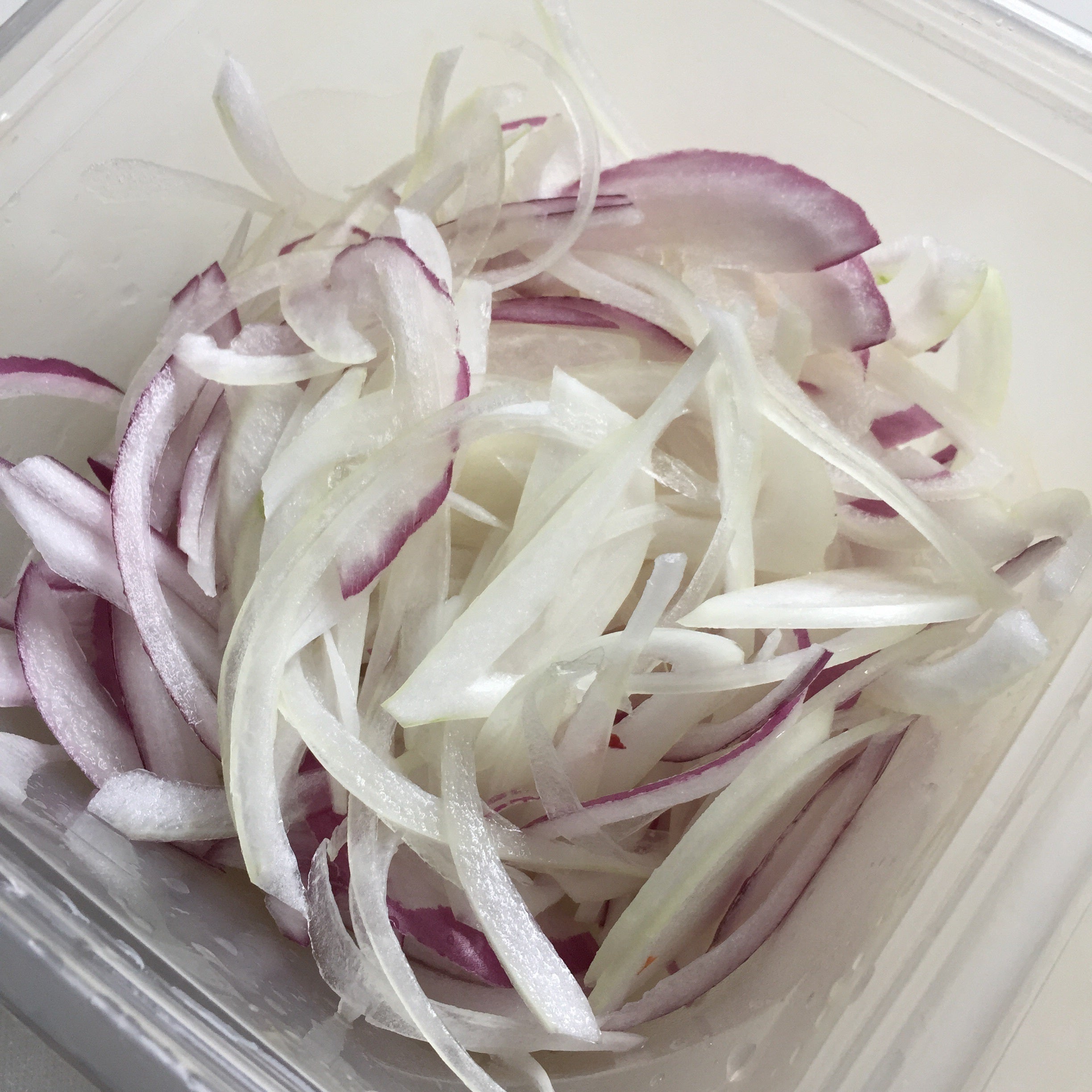 ①玉ねぎと紫玉ねぎをスライスして保存容器に入れて20~30分常温で放置しておきます。こうする事で玉ねぎの甘みがぐっと増します♡オニオンスライスを食べる際もこうしてから氷水に通してから食べると美味しいですよ^ ^