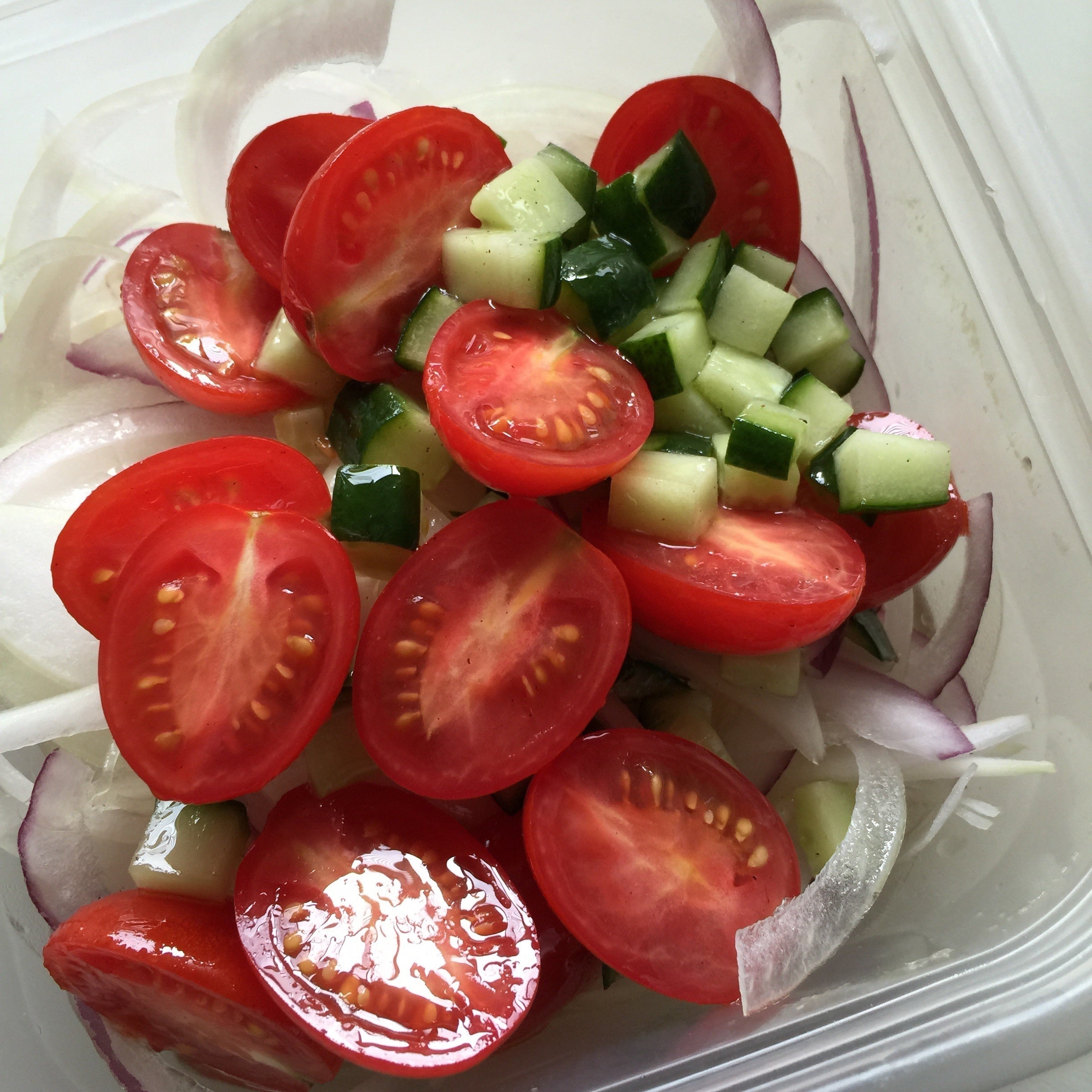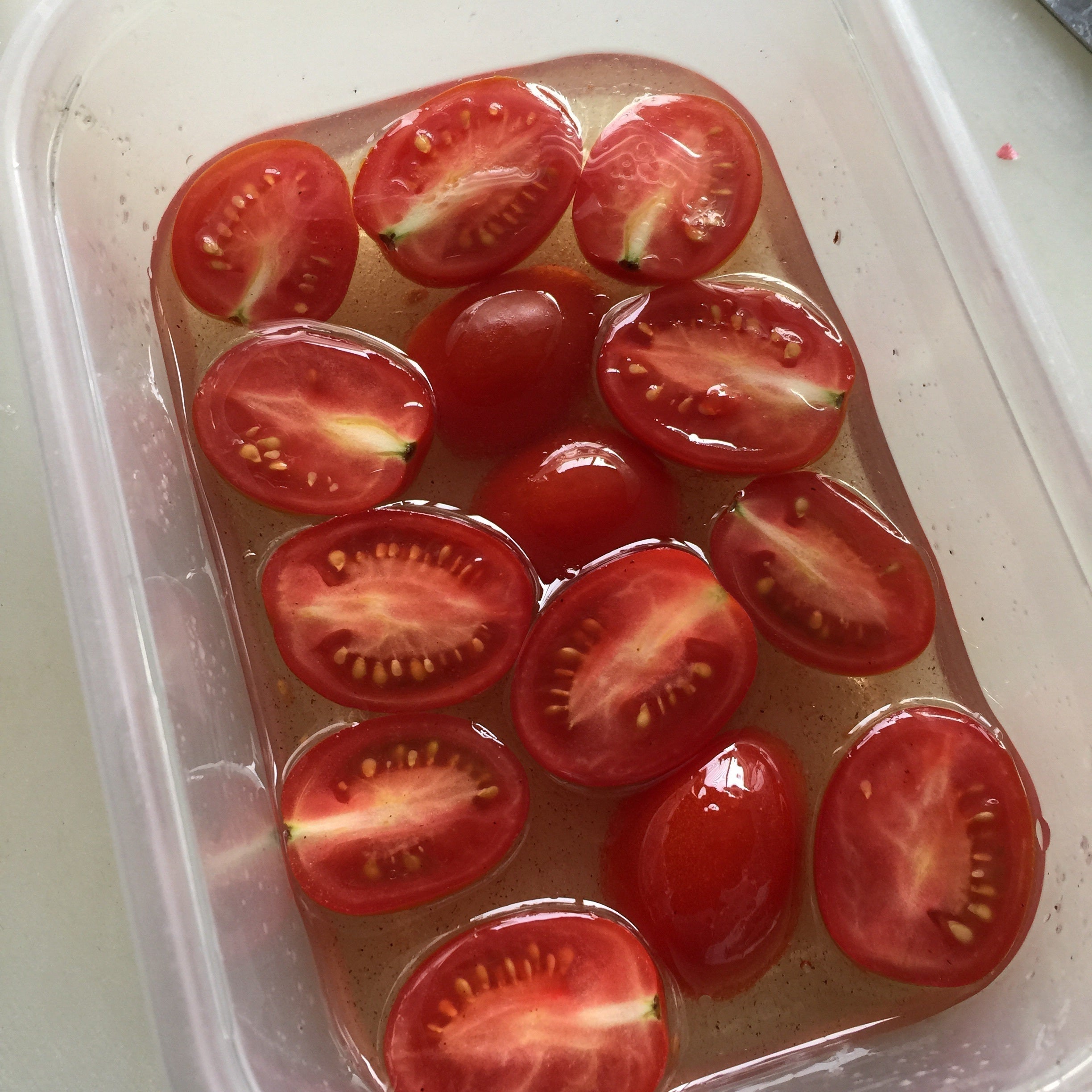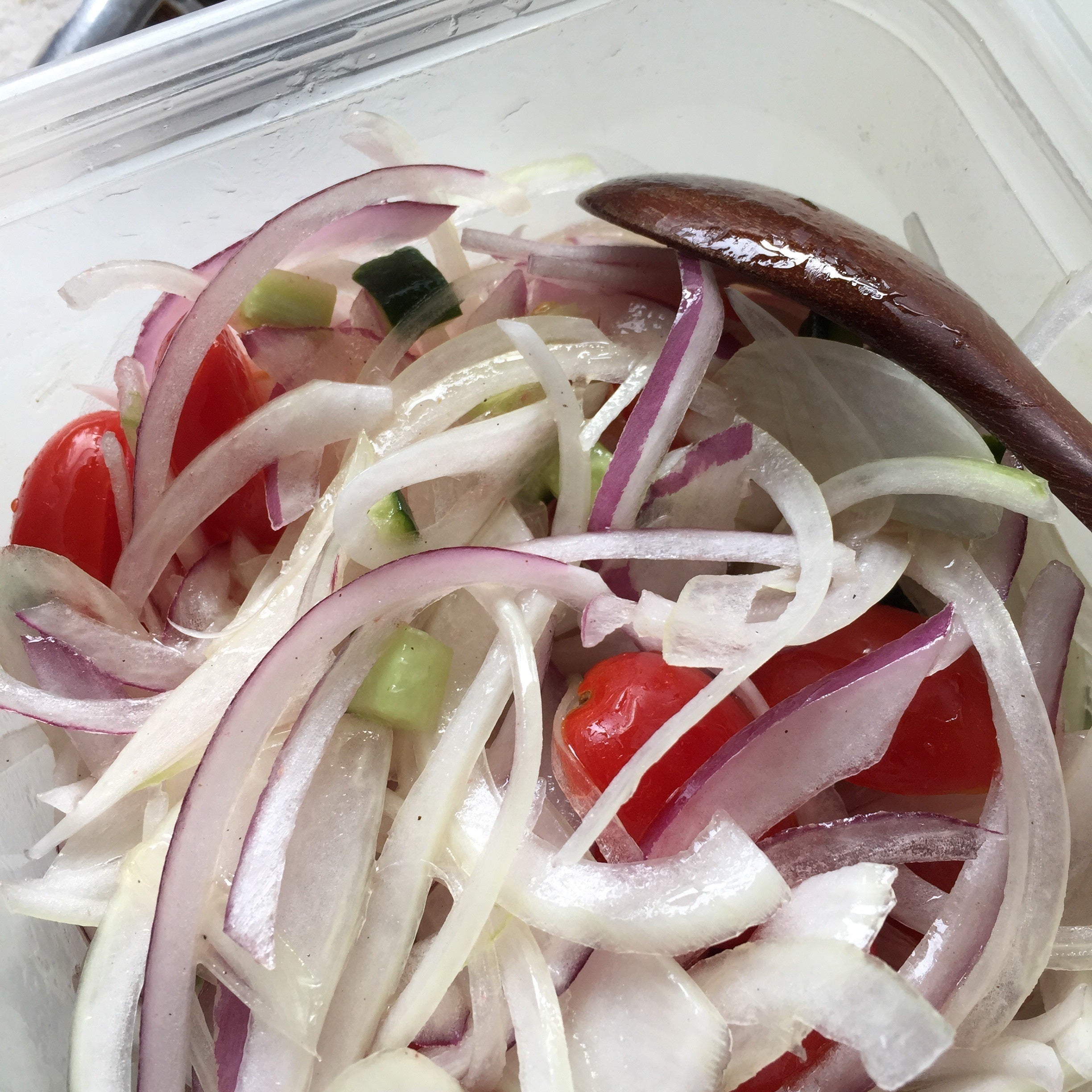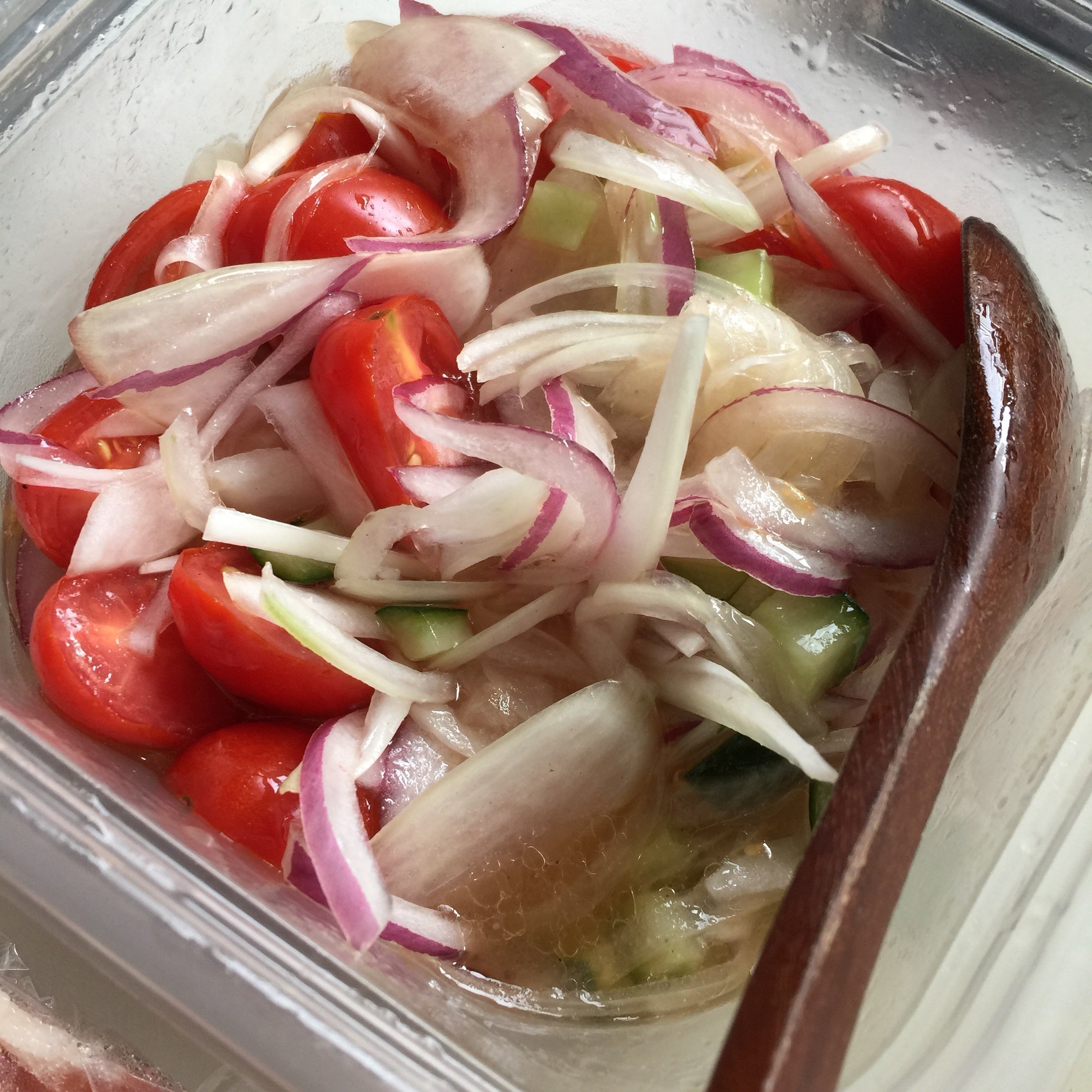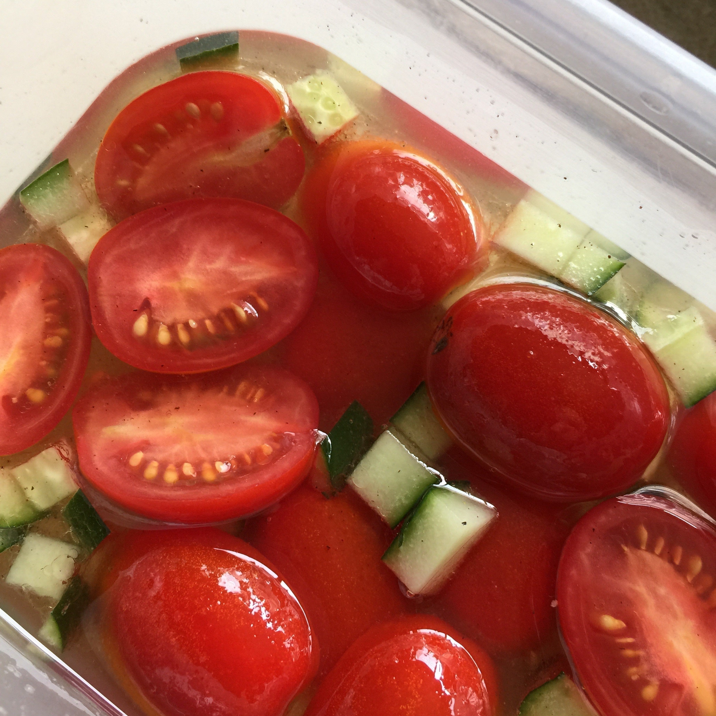⑤放置しておいた玉ねぎの中にマリネ液に漬けたトマト、きゅうり、マリネ液をを入れて軽く和えます。