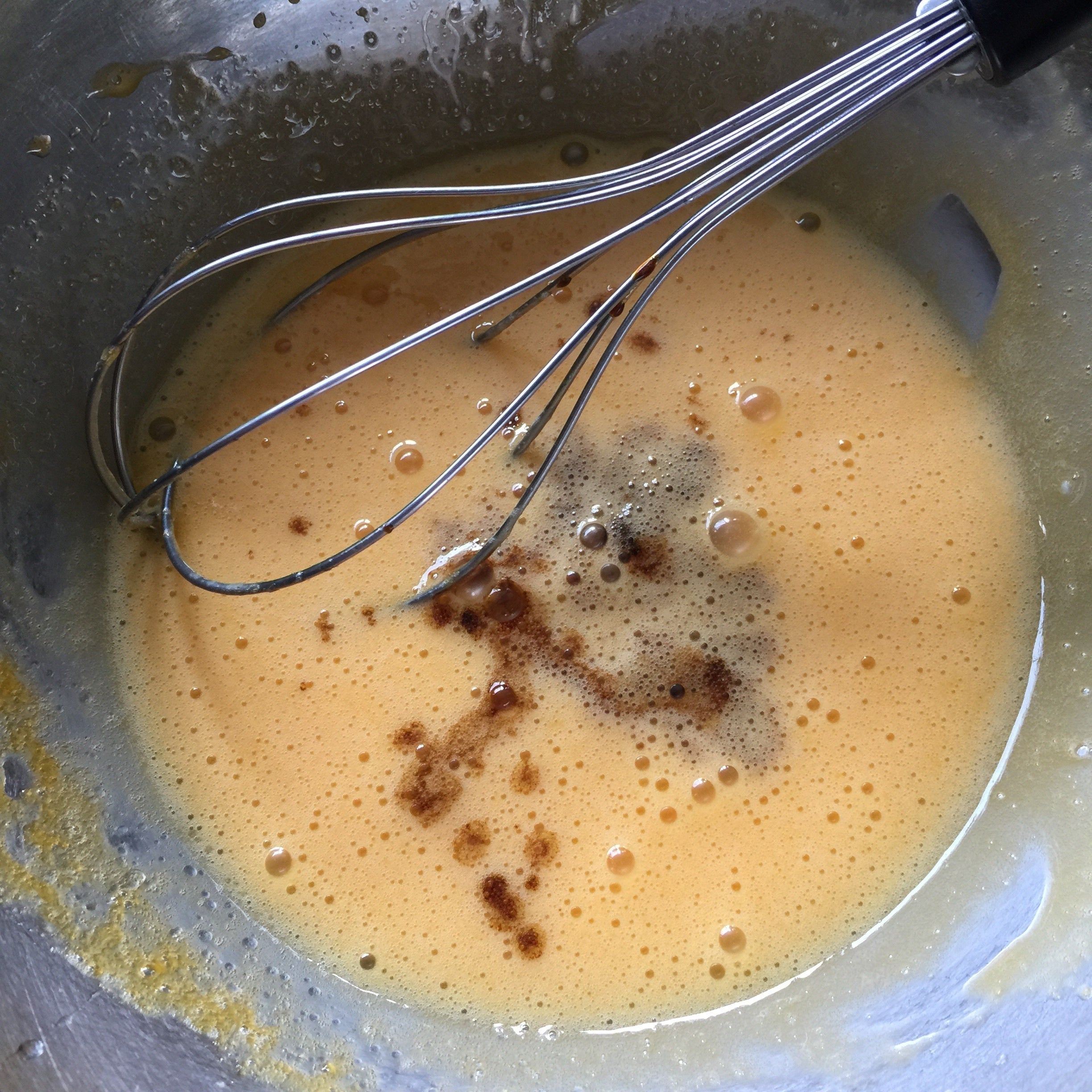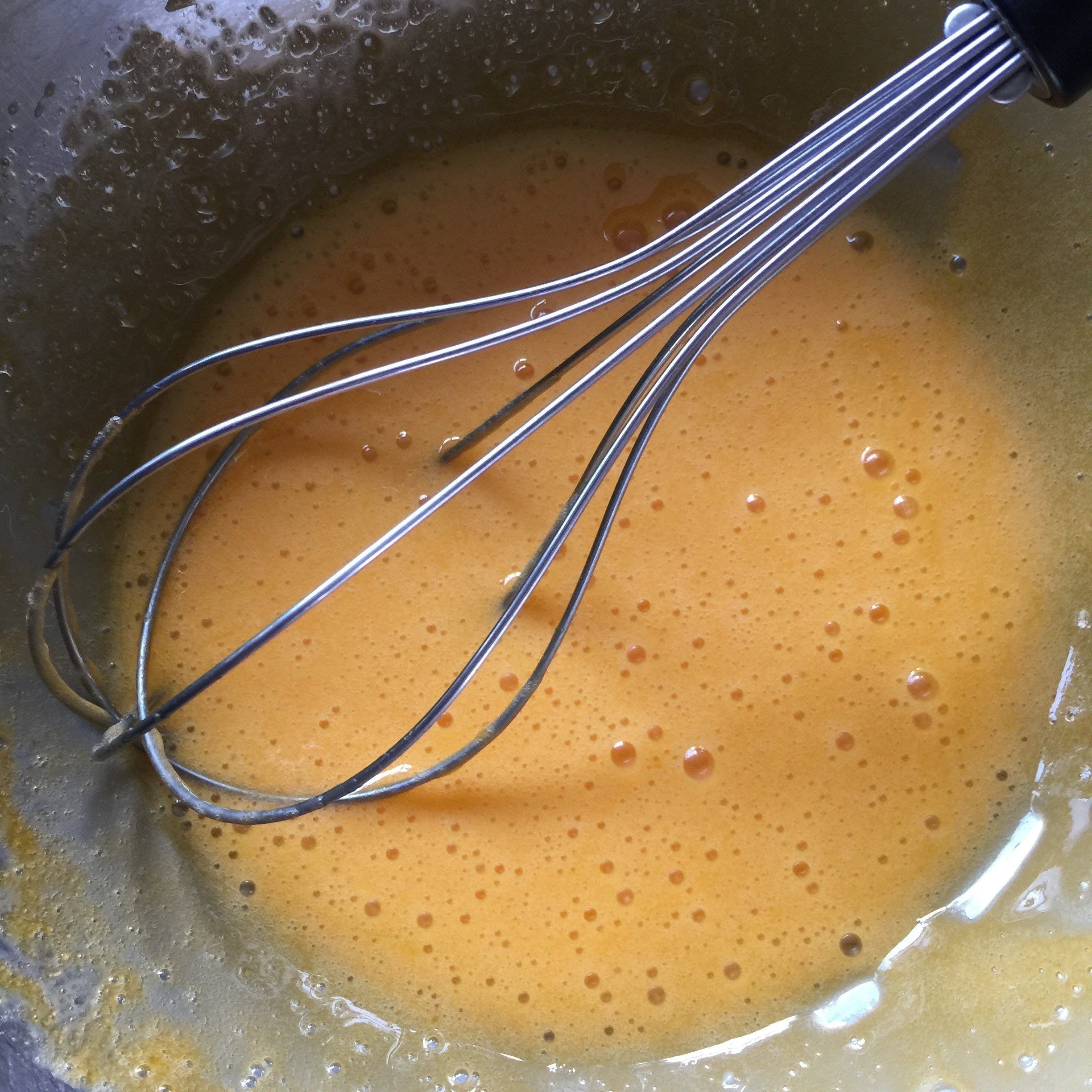 ②卵黄を泡立てます。卵黄を泡立てる際に砂糖の1/3の量を卵黄へ加えしっかり混ぜます。砂糖のシャリシャリしたおとが無くなるまで先ずは混ぜます更に卵黄が黄色から白っぽい色になるまでしっかりと泡立てます。白っぽい色になったらサラダ油を加えて更に混ぜます。
