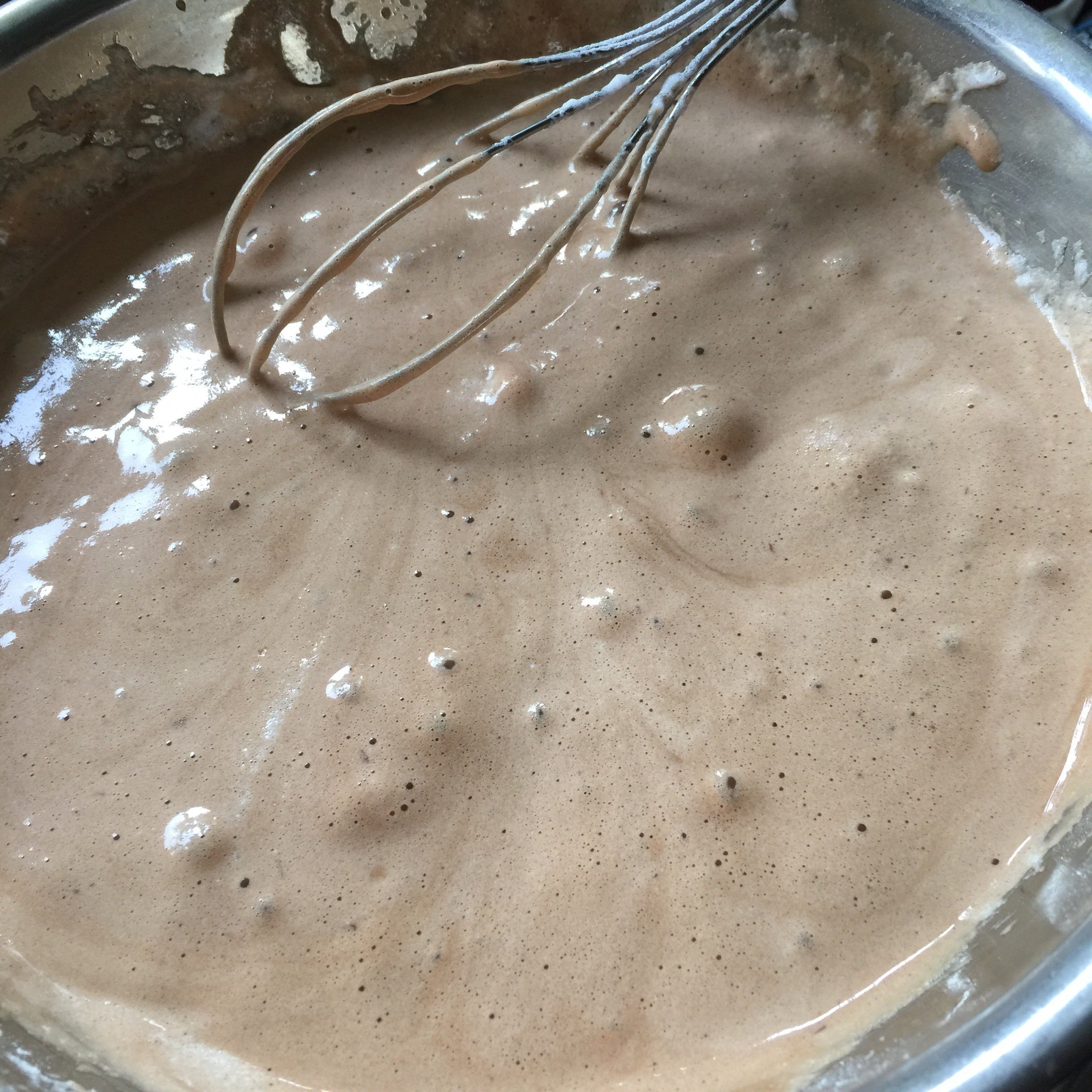④しっかり混ざったら今度はチョコレートシロップを加えて混ぜ合わせます。しっかりと混ざった所に再度、こし器でふるいにかけながら薄力粉を加えて混ぜます。