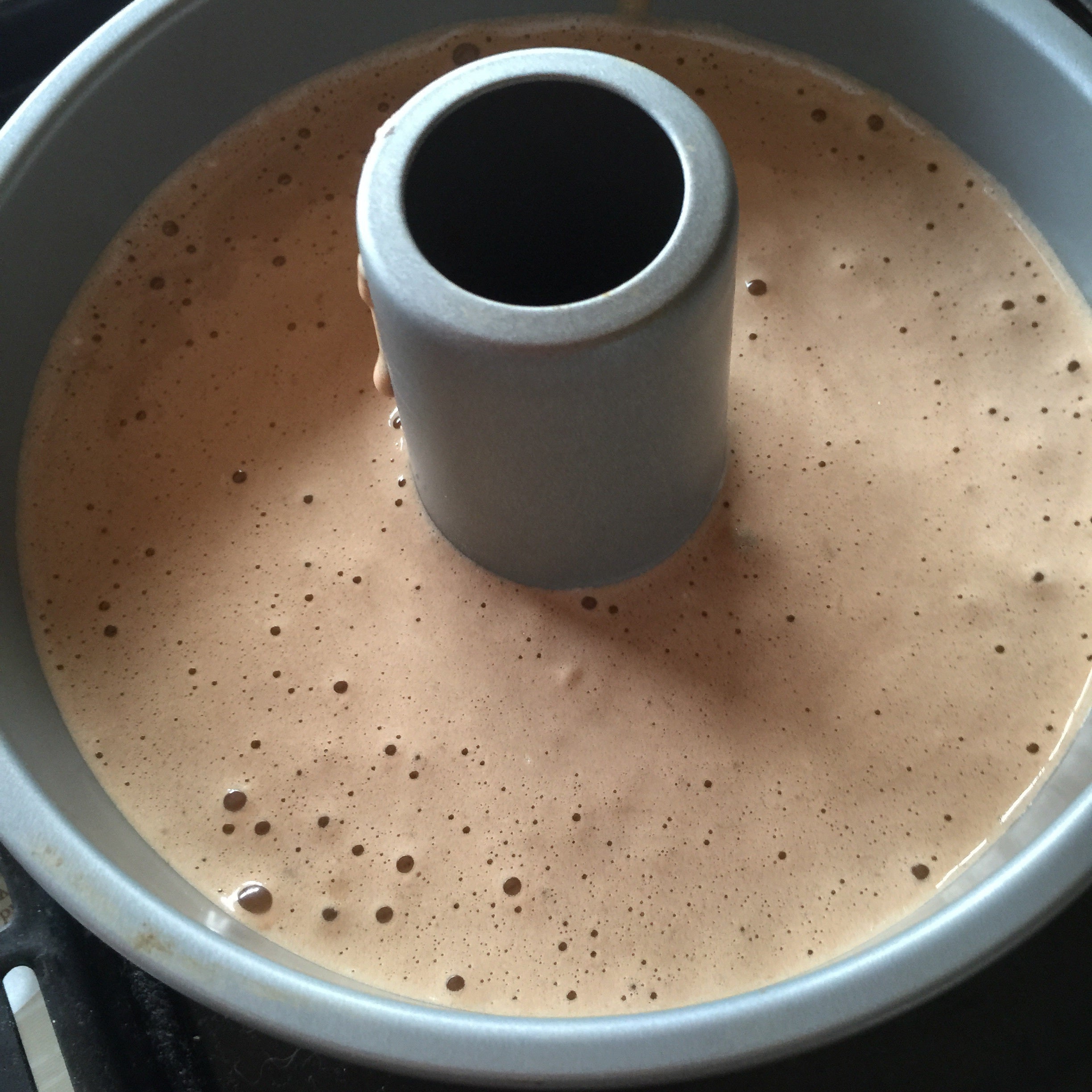 ⑨シフォン型に生地流し込みます。写真の様に空気が入っている場合は型を持ち上げて底をしっかり押さえながら1~2回底を軽くコツコツと叩いてから菜箸で生地をぐるぐると2~3回回します。菜箸を入れるコトで空気も出て、気づかなかったメレンゲの塊を無くすコトも出きます。