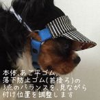 いつもはヒッコリーストライプのスポーティなサンバイザー。「少しだけ違う」のを楽しんで欲しくて今回は可愛い「いちご柄」が表に出ています。裏側はシンプルなデニムで。いちごの中に入っているストライプやドットをさりげなくコーディネートしてお洋服を選ぶと、キュートなバイザーわんこの完成です。