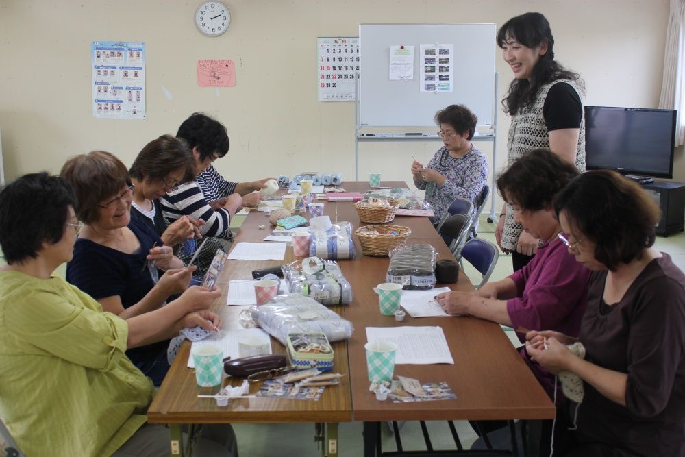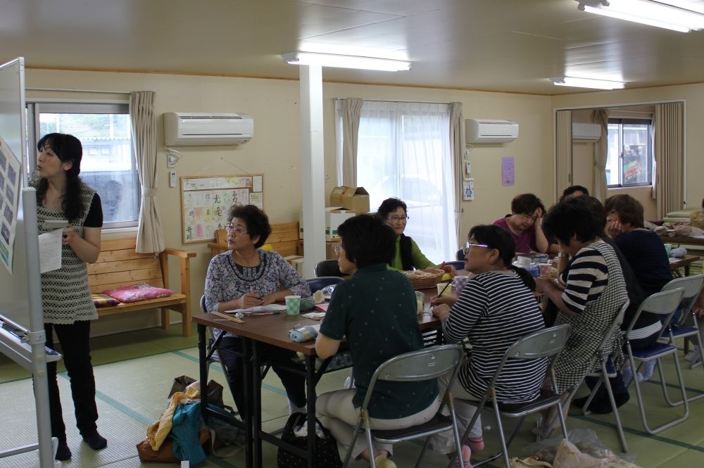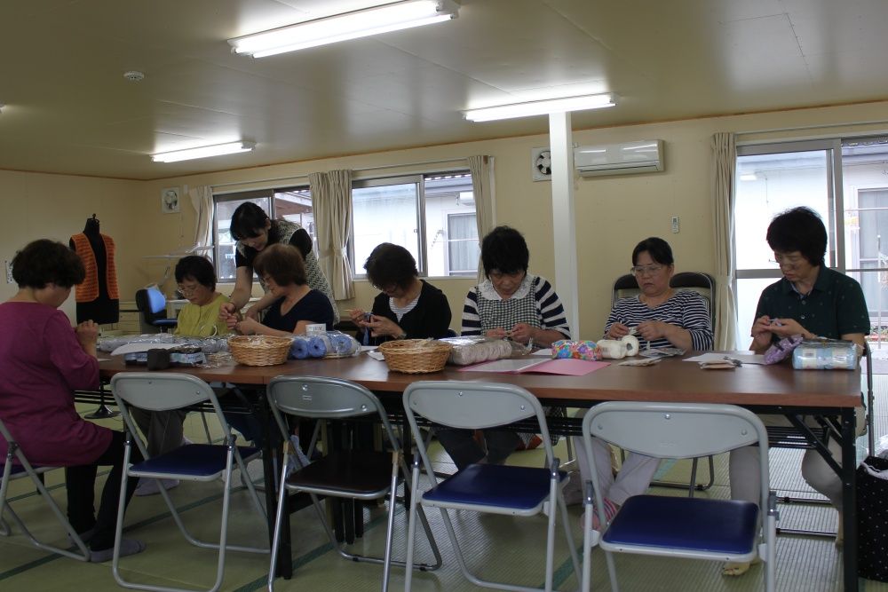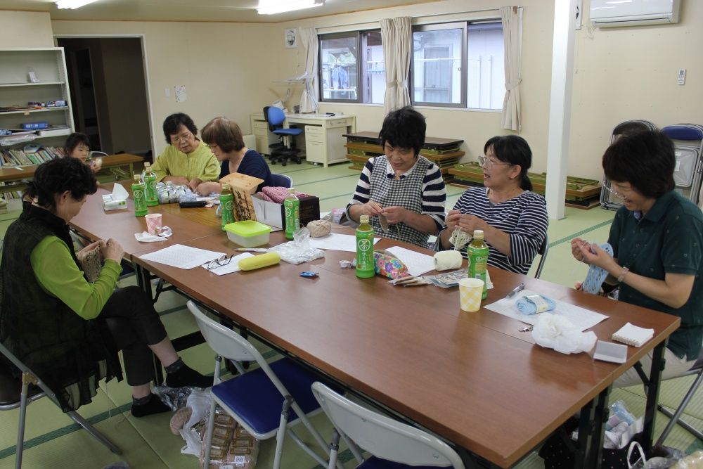 石巻市仮設旭化成団地集会所での被災地編み物お茶っこ飲み