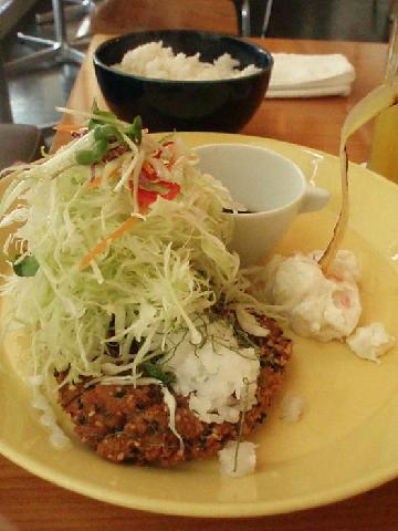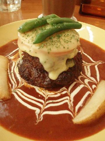 小さめのハンバーグが2つ重ねてあって、真ん中には