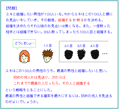 そして、この問題ぼアレンジをちょっと変えてみると、次のような 「お見合い問題」 や 「結婚問題」 にも化けるわけです。(笑)