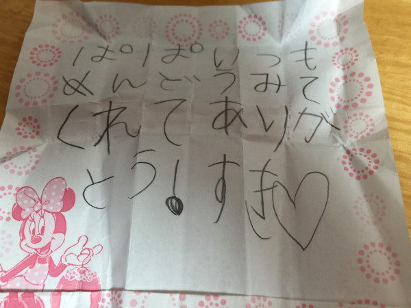 メッセージ付き折り紙 このかわいい折り紙を開くと、、、 こんなんなってました。 きっと娘は折ったままにしておいてもらいたいんだと思うけど、僕は開いたものの方が好きです。ありがとう。いつまで言ってもらえるかな。パパ、頑張ります。 via チョコまろ屋 Your own website, Ameba Ownd