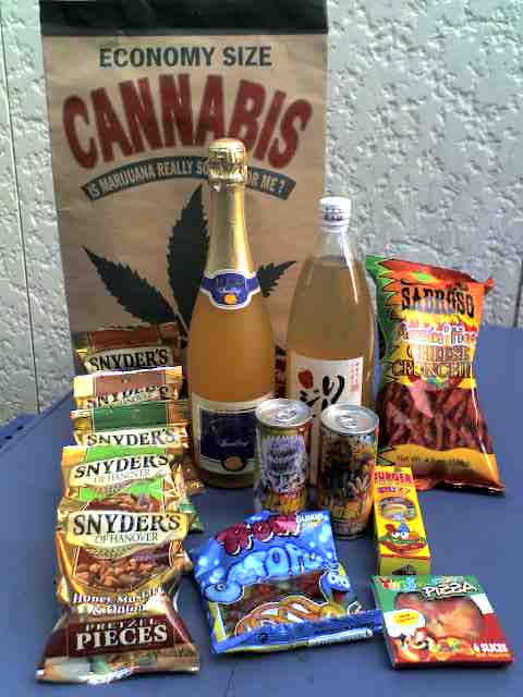 「果実酒とジャンクフードの詰め合わせ」