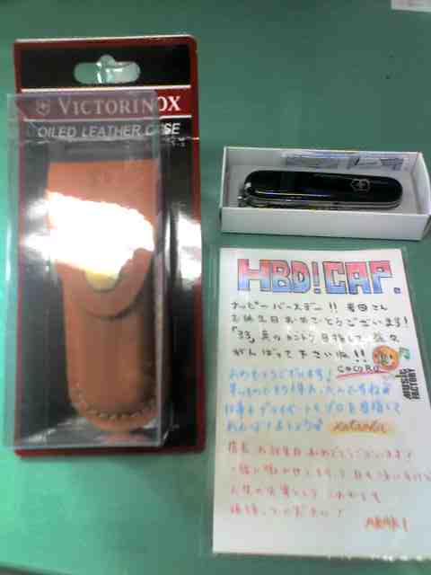 6266月26日え~と僕の誕生日でした33歳。。。まだギリでおめでたいか??今年も皆様にお祝いのメッセージやプレゼントを頂き感激な1日でしたスタッフからアウトドア好きの僕の趣味を踏まえ「victorinox」のオフィサーナイフとオイルレザーのケースとケーキお客様でもあり友人でもあるチカラ&ルーリーよりシュークリームとチーズケーキ素敵なお客様、オカッパののトケちゃんよりアローズの靴下と素敵なドットのハンケチとケーキみんな本当にホントウニアリガトウメッチャ感動した