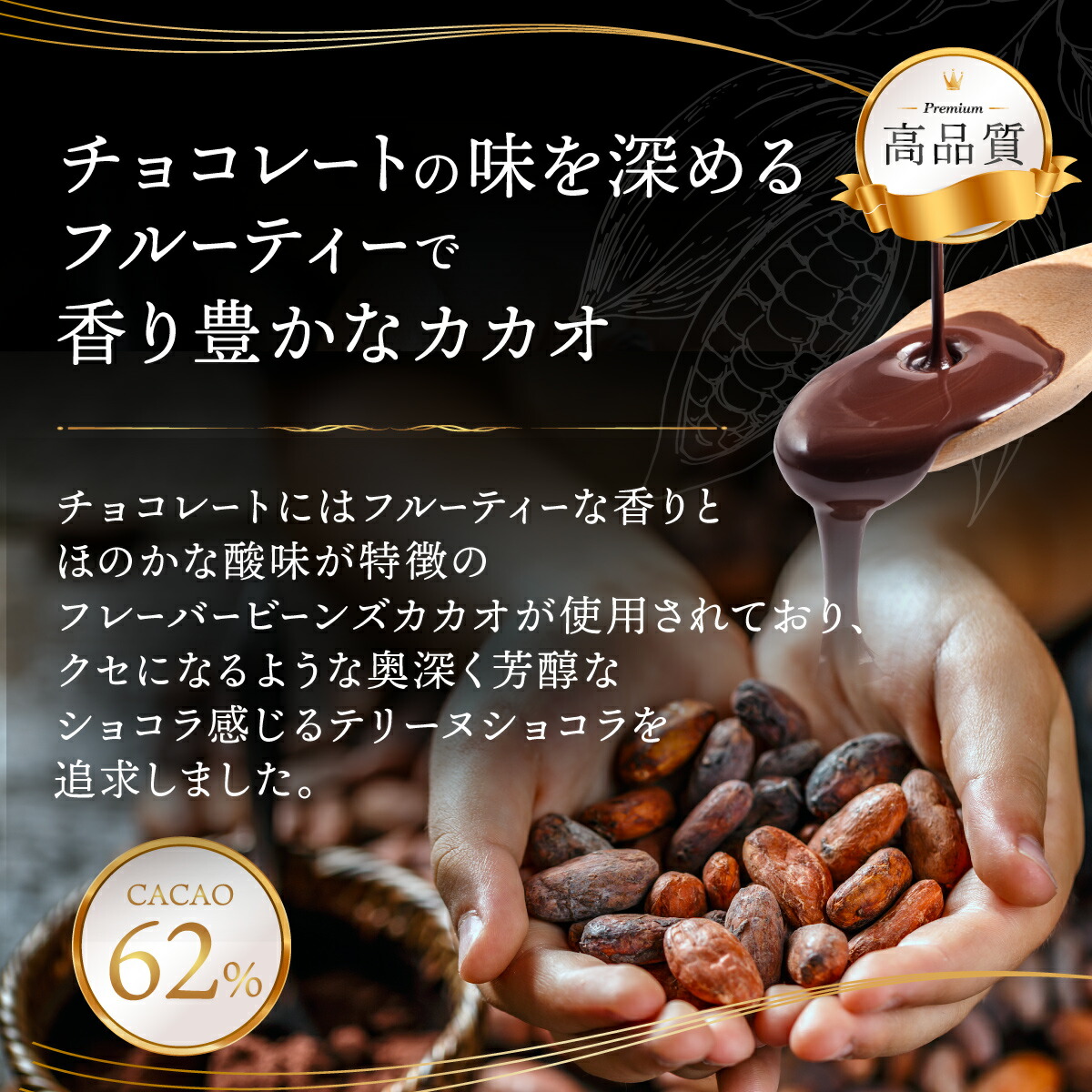 カカオ62%のものを使用しているのでちょっと大人な風味で、ほんのりフルーティーな酸味も後味に感じます。