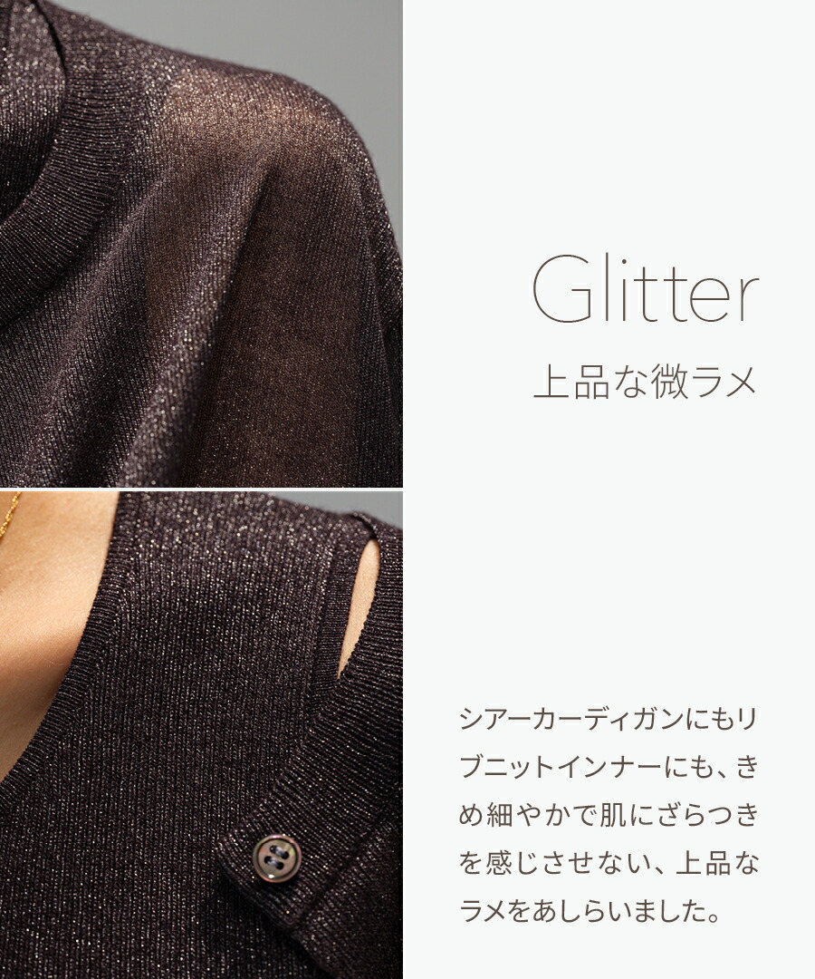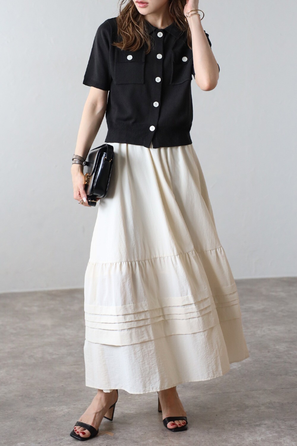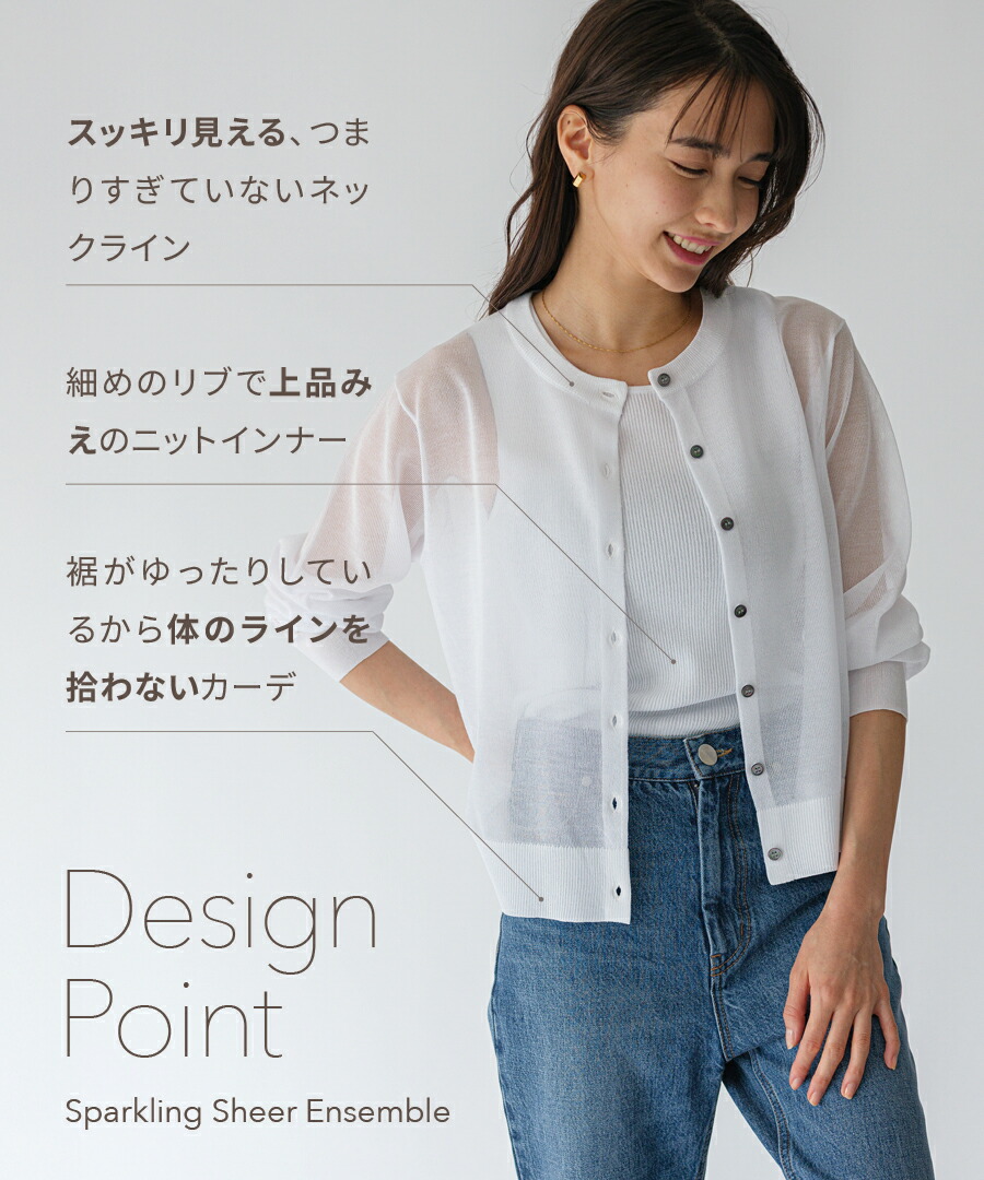 上から羽織るカーディガンは少しシャリっとした素材で、透け感があります!