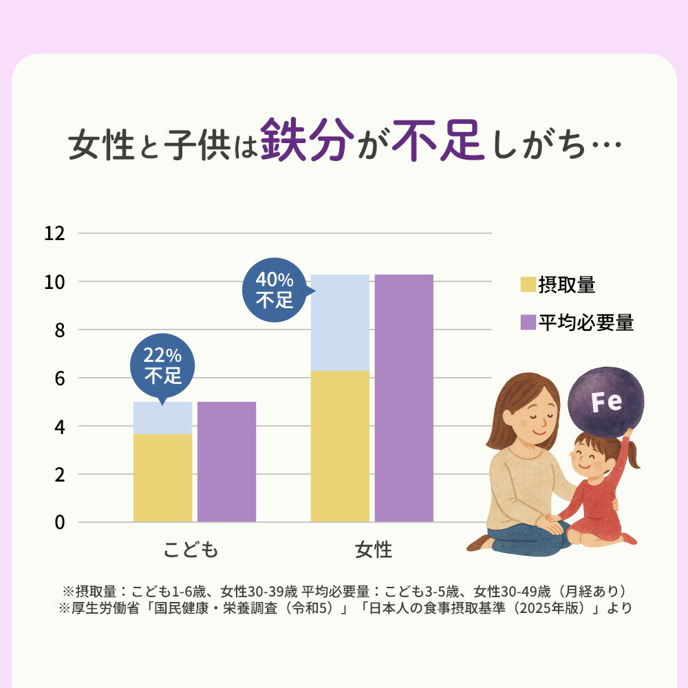 厚生労働省の調査によると女性と子供は鉄分が不足しがちなんだって!