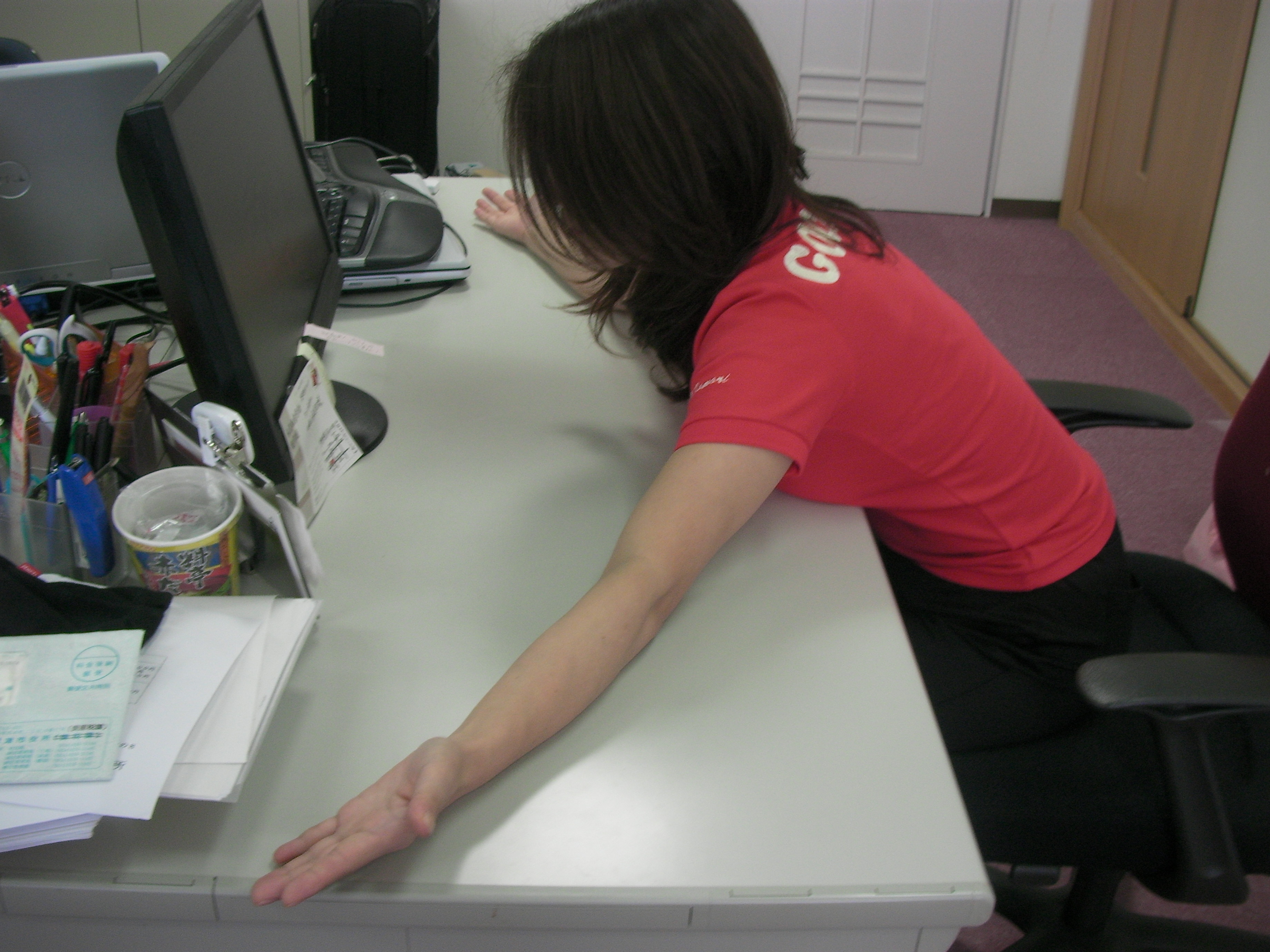 こうすることによって長時間事務仕事で縮んだ背中が伸びますよ!!