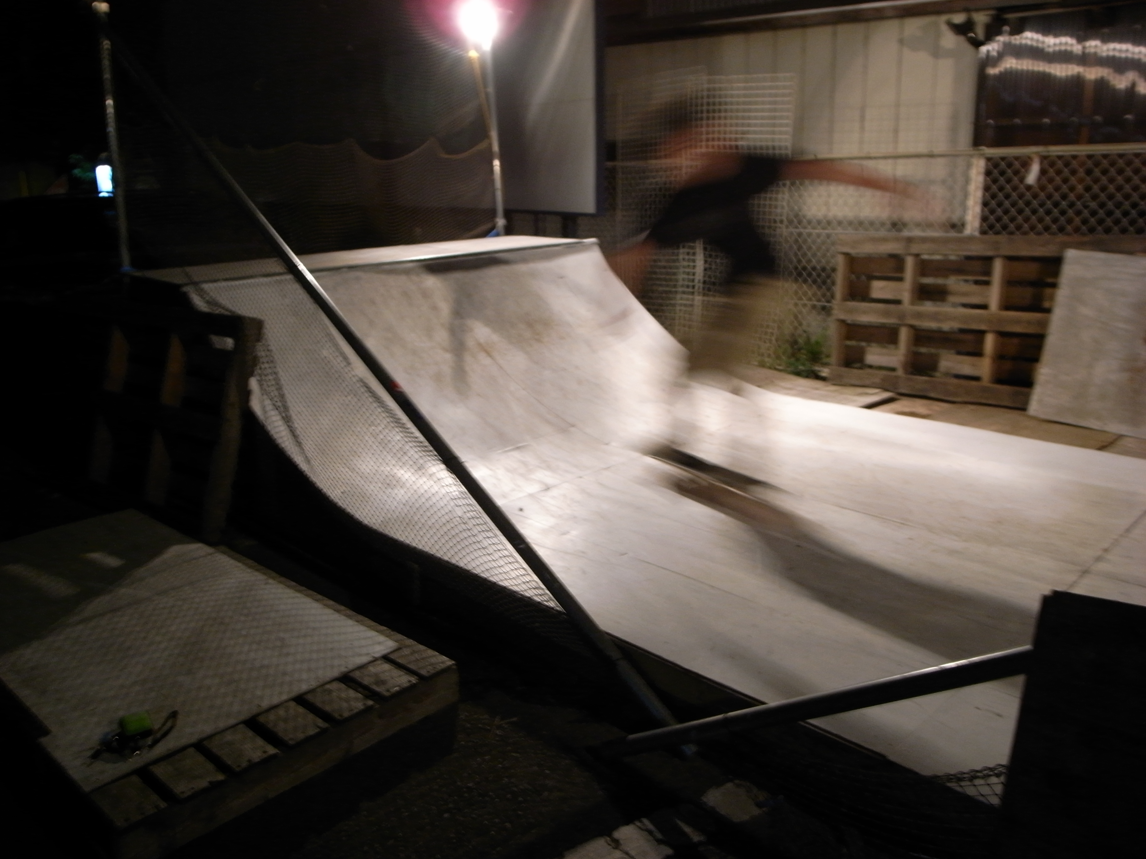 ランプでまあまあ調子が良かったので、調子にのってやっていると、バンクの上で回りきれず受身も取れず、背中から落下(苦笑)