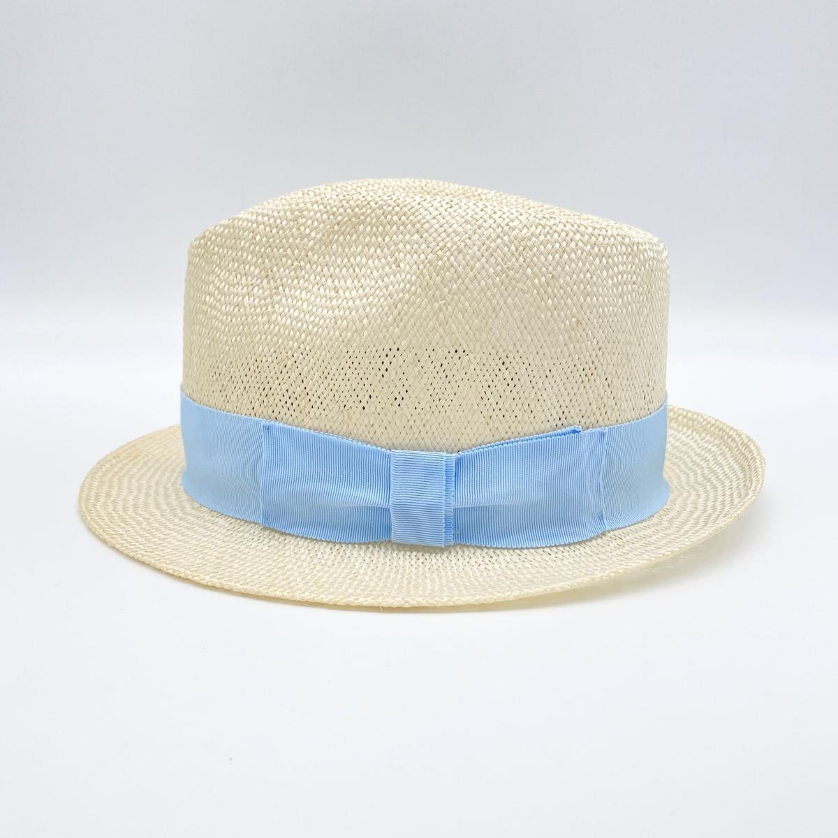 ホワイトの帽体に、爽やかな水色のリボンをあしらいました。
