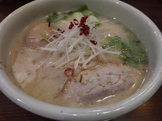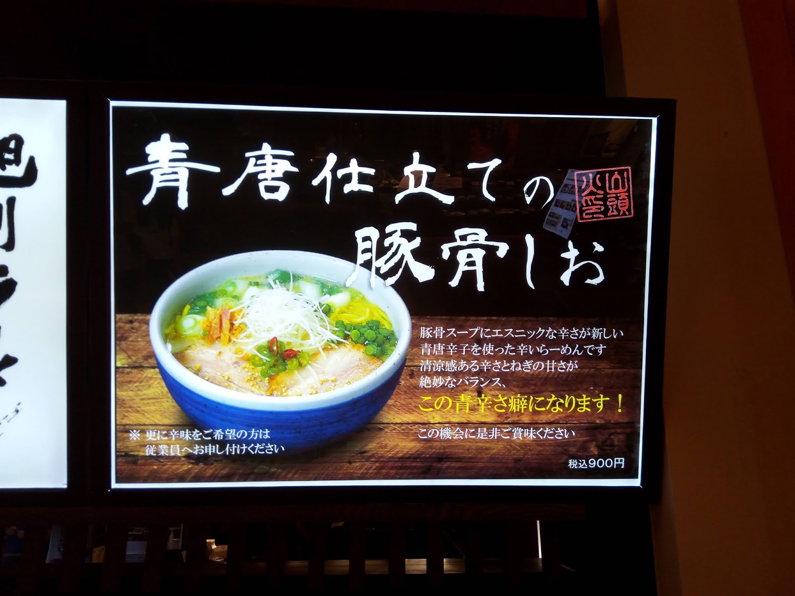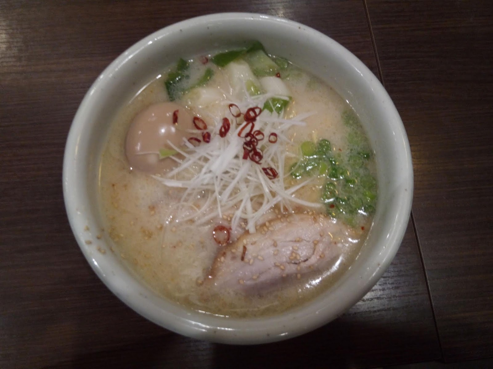 見た目は普通の豚骨しおに万能ねぎと赤トウガラシがトッピングされているだけに見えます
